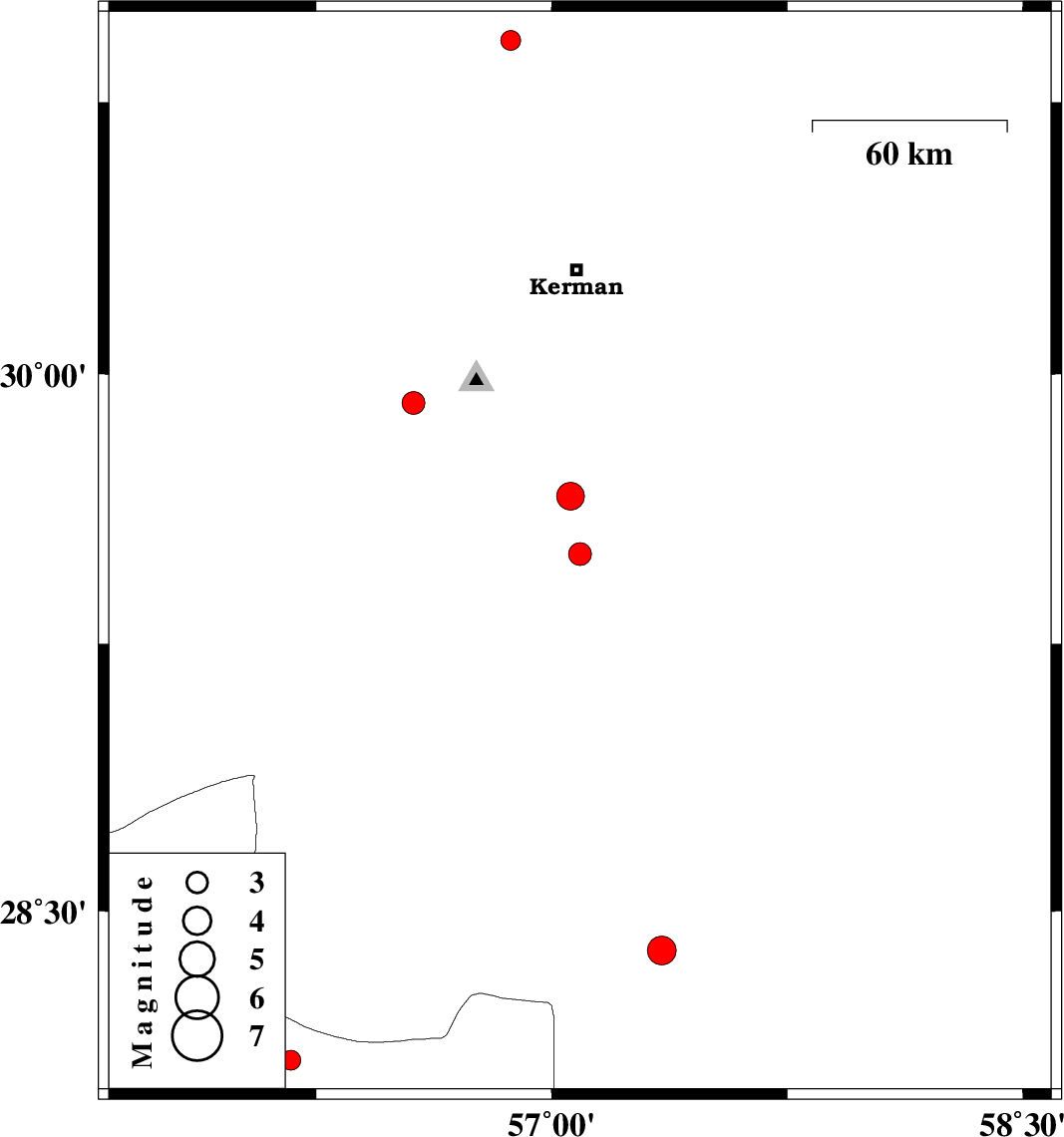 | 2013/02/16 | 13:09:05.1 | 16:39:05.1 | 28.39 | 57.35 | 14 | ML:4.1 | Kerman Province, 49 km South-West of Jiroft |