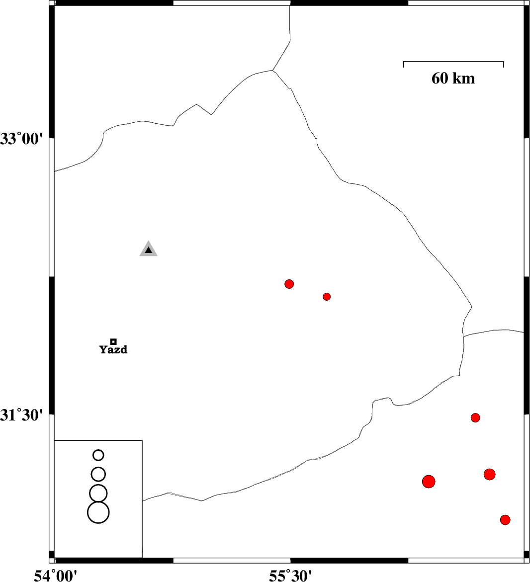 2013/02/22 14:37:28.5 18:07:28.5 32.1455.7337 ML:2.1 Yazd Province, 67 km North-East of Bafq