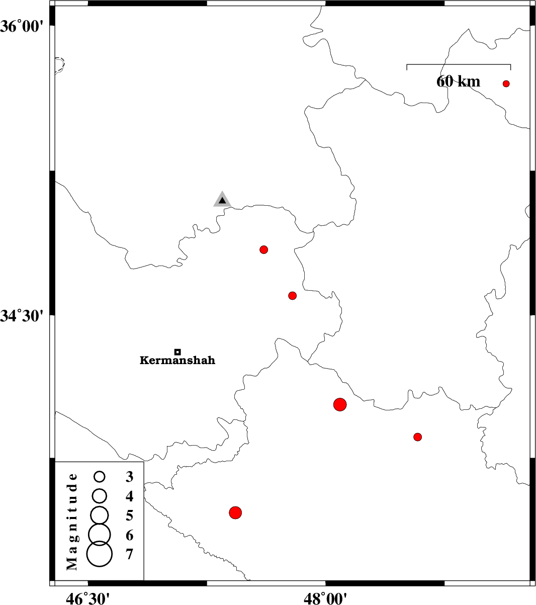 | 2013/02/23 | 19:27:23.6 | 22:57:23.6 | 34.84 | 47.61 | 14 | ML:2.3 | Kermanshah Province, 7 km Sonqor | ||