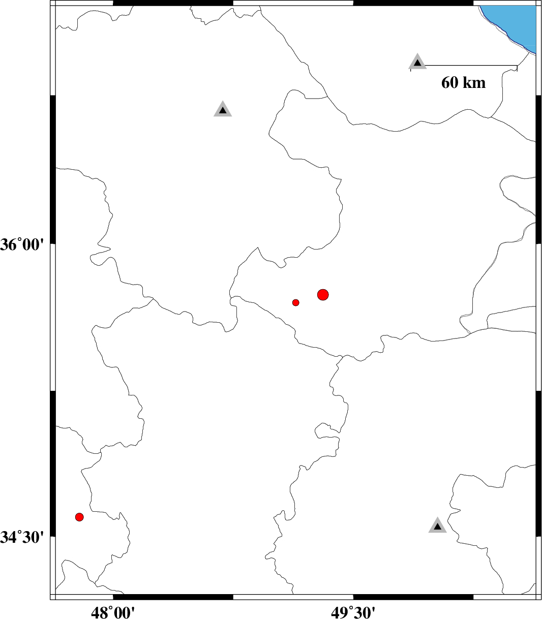 | 2013/02/25 | 19:23:28.3 | 22:53:28.3 | 35.7 | 49.14 | 30 | ML:1.8 | Ghazvin Province, 37 km North of Razan | ||
