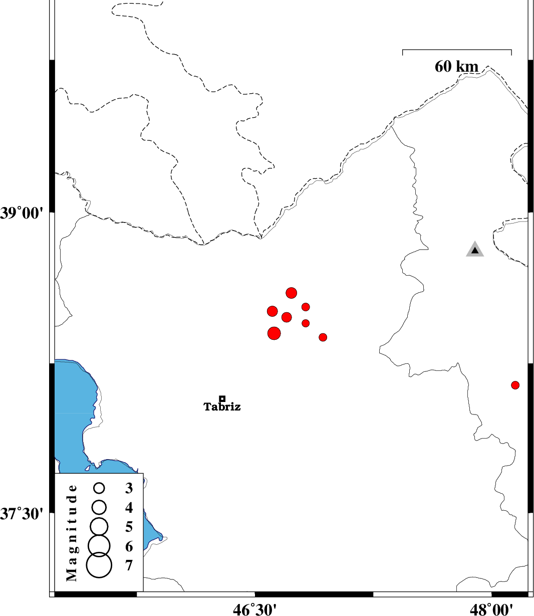| 2013/02/24 | 02:41:25.4 | 06:11:25.4 | 38.45 | 46.82 | 14 | ML:2.1 | Azarbaijan Sharghi Province, 23 km West of Ahar | ||