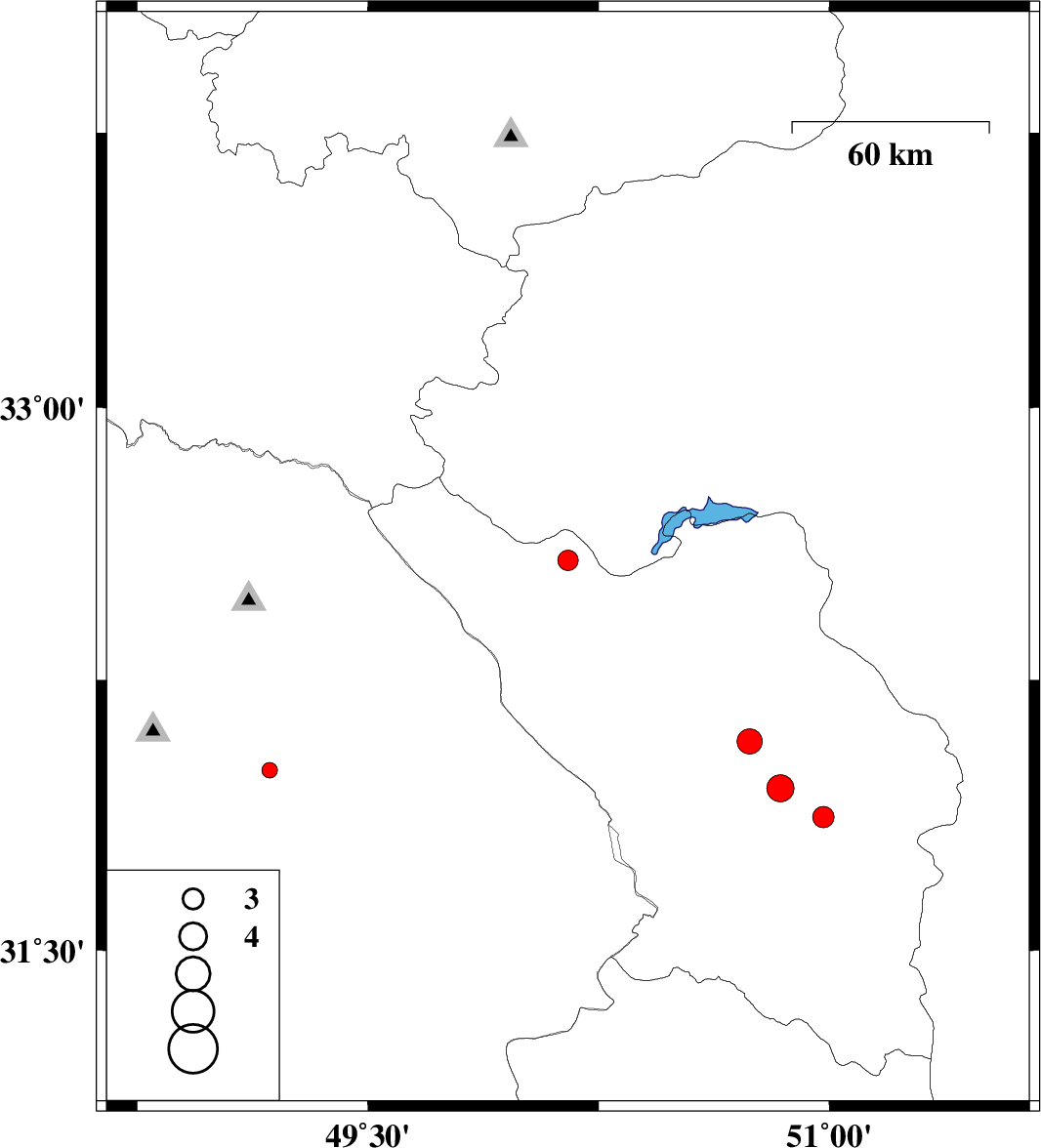 | 2013/03/02 | 19:24:30.1 | 22:54:30.1 | 31.95 | 50.84 | 14 | ML:3.9 | Chaharmahal Bakhtiari Province, 18 km East of Ardel | ||