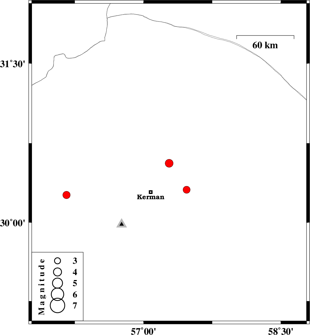 | 2013/03/03 | 16:11:13.8 | 19:41:13.8 | 30.56 | 57.28 | 14 | ML:3.9 | Kerman Province, 36 km North-East of Kerman | ||