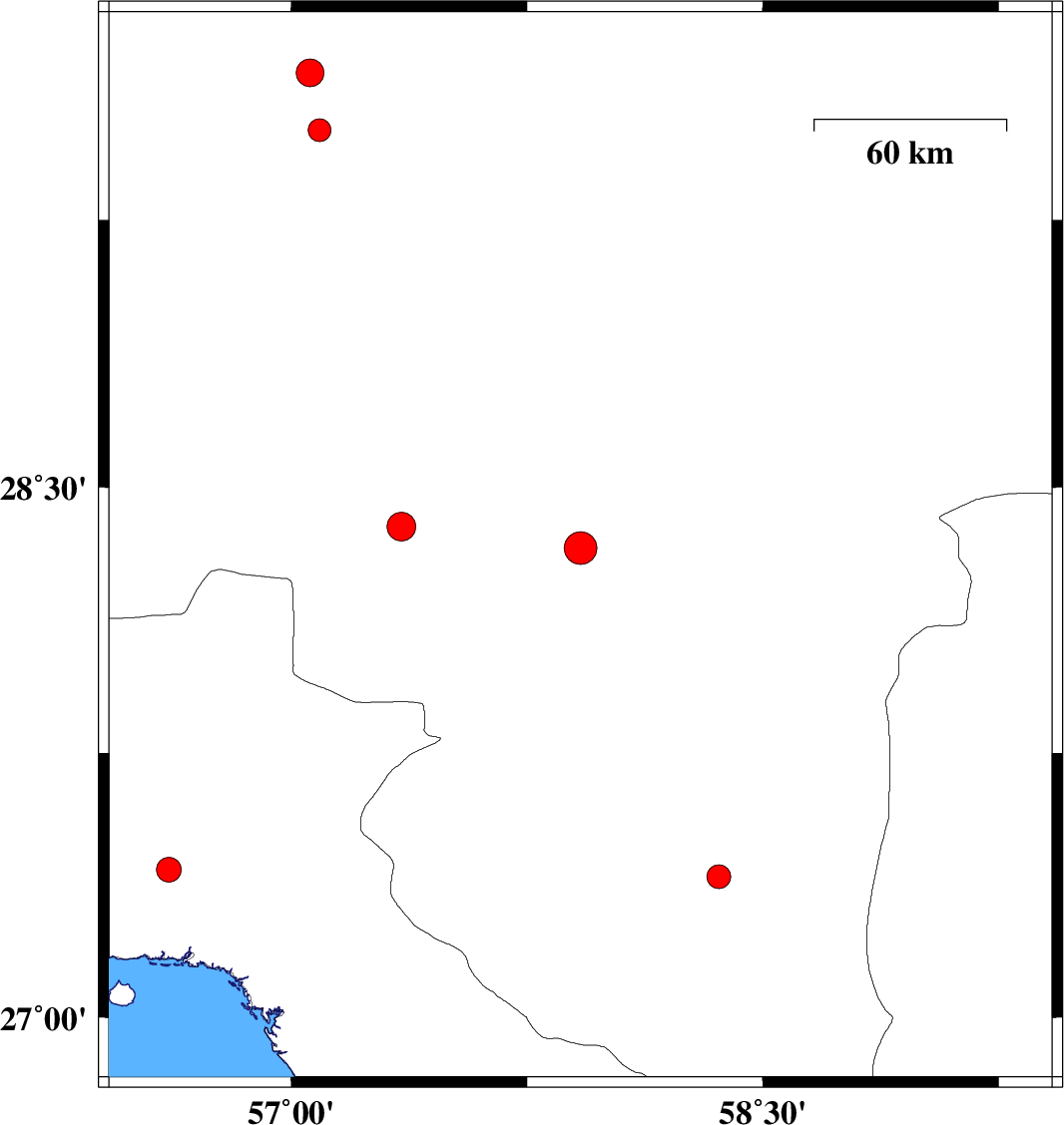 | 2013/02/16 | 13:09:05.1 | 16:39:05.1 | 28.39 | 57.35 | 14 | ML:4.1 | Kerman Province, 49 km South-West of Jiroft | ||