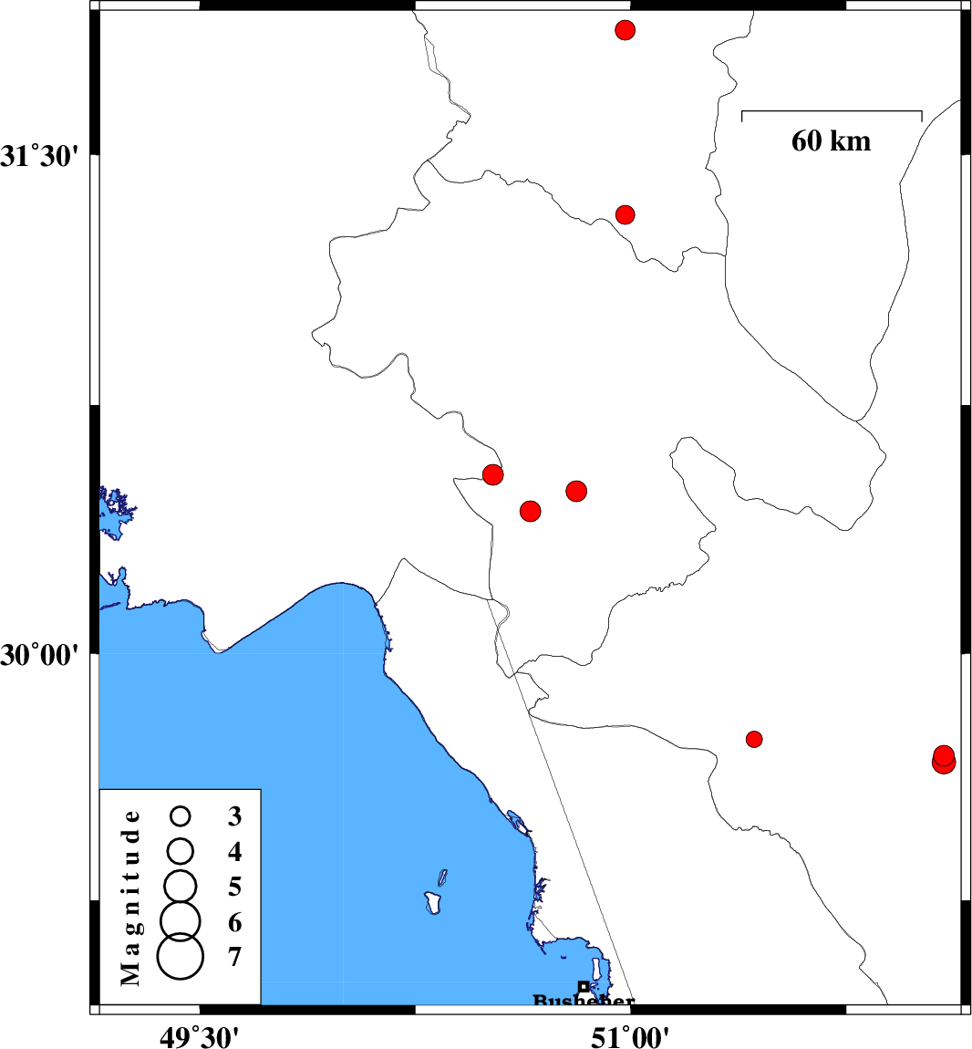 | 2013/02/26 | 00:54:54.3 | 04:24:54.3 | 29.74 | 51.43 | 18 | ML:2.5 | Fars Province, 26 km North-West of Kazerun | ||