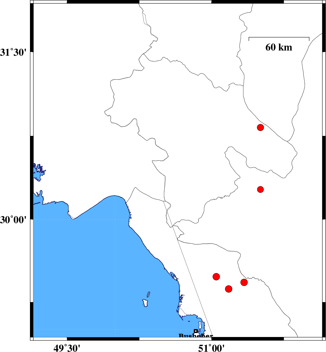 | 2013/02/28 | 14:56:49.1 | 18:26:49.1 | 29.69 | 52.09 | 40 | ML:3.2 | Fars Province, 43 km East of Kazerun | ||