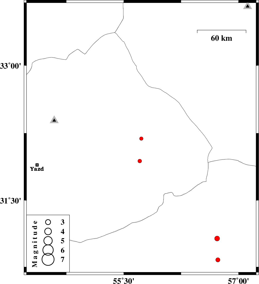 | 2013/03/11 | 19:02:08.4 | 22:32:08.4 | 32.19 | 55.73 | 14 | ML:2.1 | Yazd Province, 73 km North-East of Bafq | ||