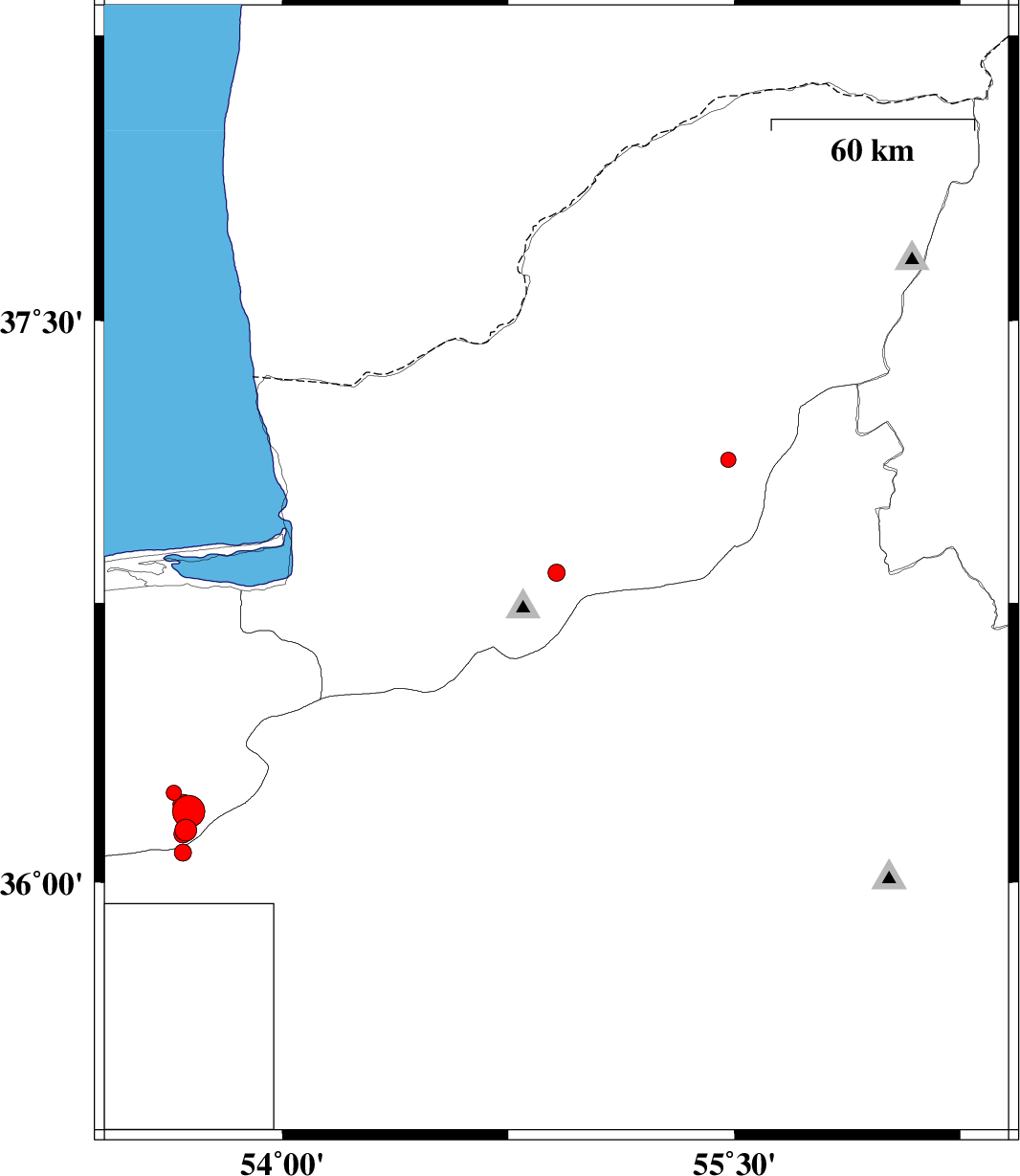 | 2013/03/21 | 19:37:04.7 | 23:07:04.7 | 36.19 | 53.69 | 14 | ML:4.8 | Mazandaran Province, 58 km South-East of Behshahr | ||
