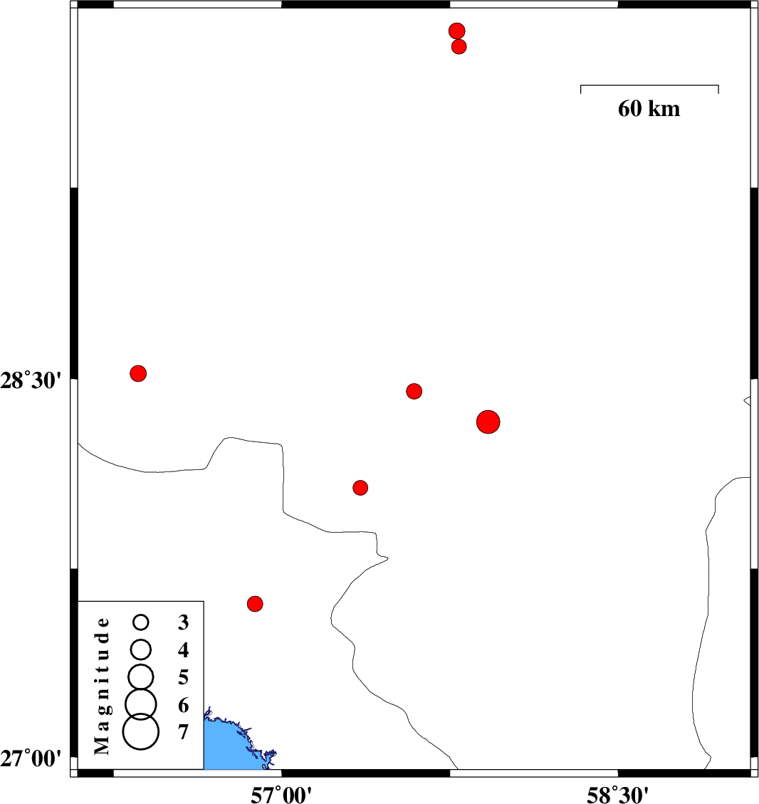 | 2013/03/11 | 13:30:43.4 | 17:00:43.4 | 29.8 | 57.79 | 14 | ML:3 | Kerman Province, 126 km North of Jiroft | ||