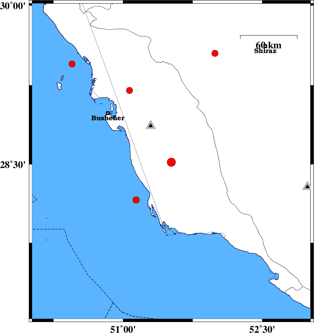 | 2013/03/16 | 19:33:38.1 | 23:03:38.1 | 29.2 | 51.07 | 17 | ML:3.1 | Bushehr Province, 15 km West of Borazjan |