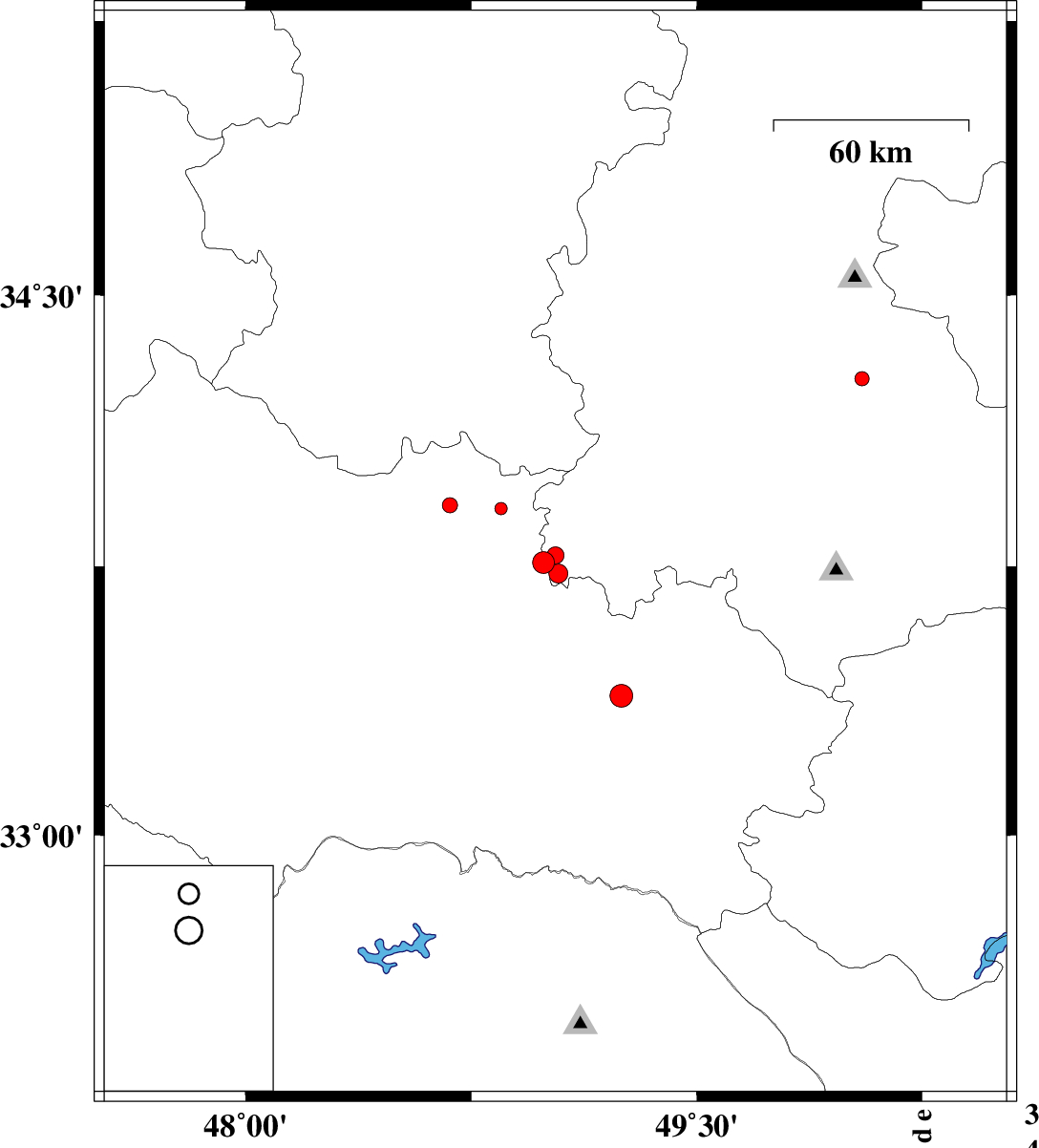 | 2013/03/31 | 06:52:30.0 | 11:22:30.0 | 33.91 | 48.85 | 14 | ML:1.9 | Lorestan Province, 8 km Borujerd |