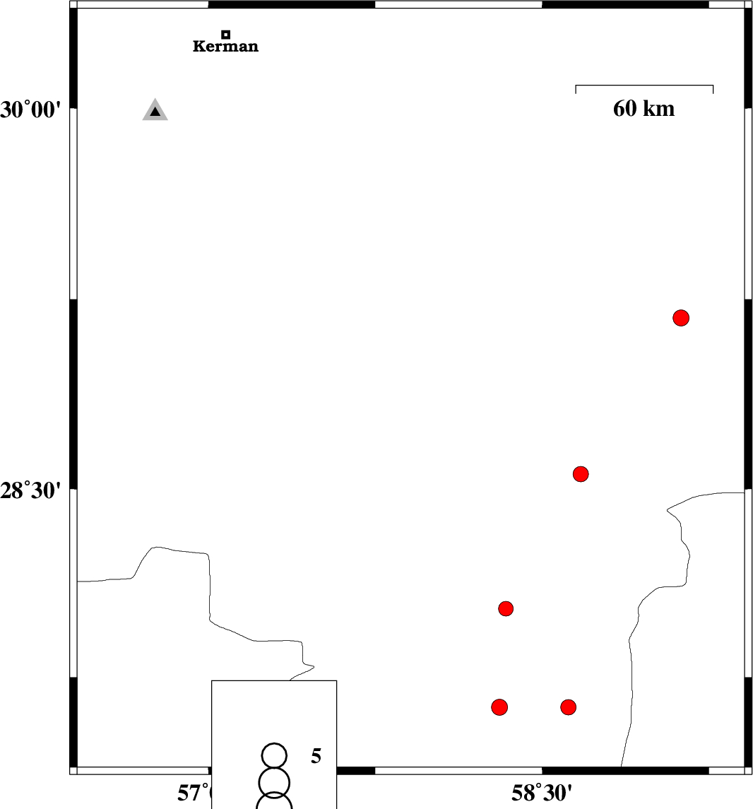 | 2013/03/11 | 13:30:43.4 | 17:00:43.4 | 29.8 | 57.79 | 14 | ML:3 | Kerman Province, 126 km North of Jiroft |