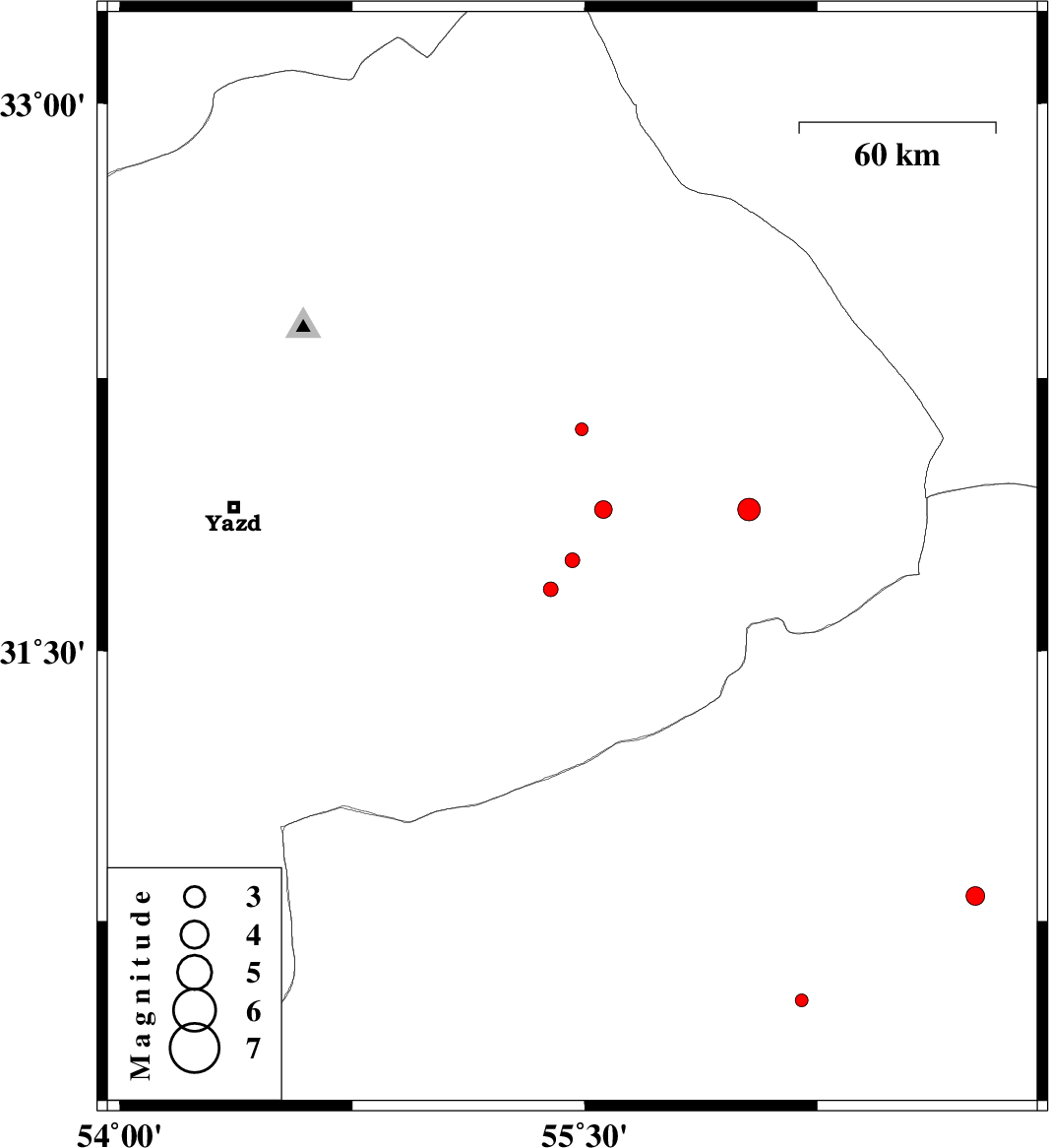 | 2013/03/14 | 11:23:18.8 | 14:53:18.8 | 32.11 | 55.49 | 14 | ML:1.8 | Yazd Province, 57 km North of Bafq |