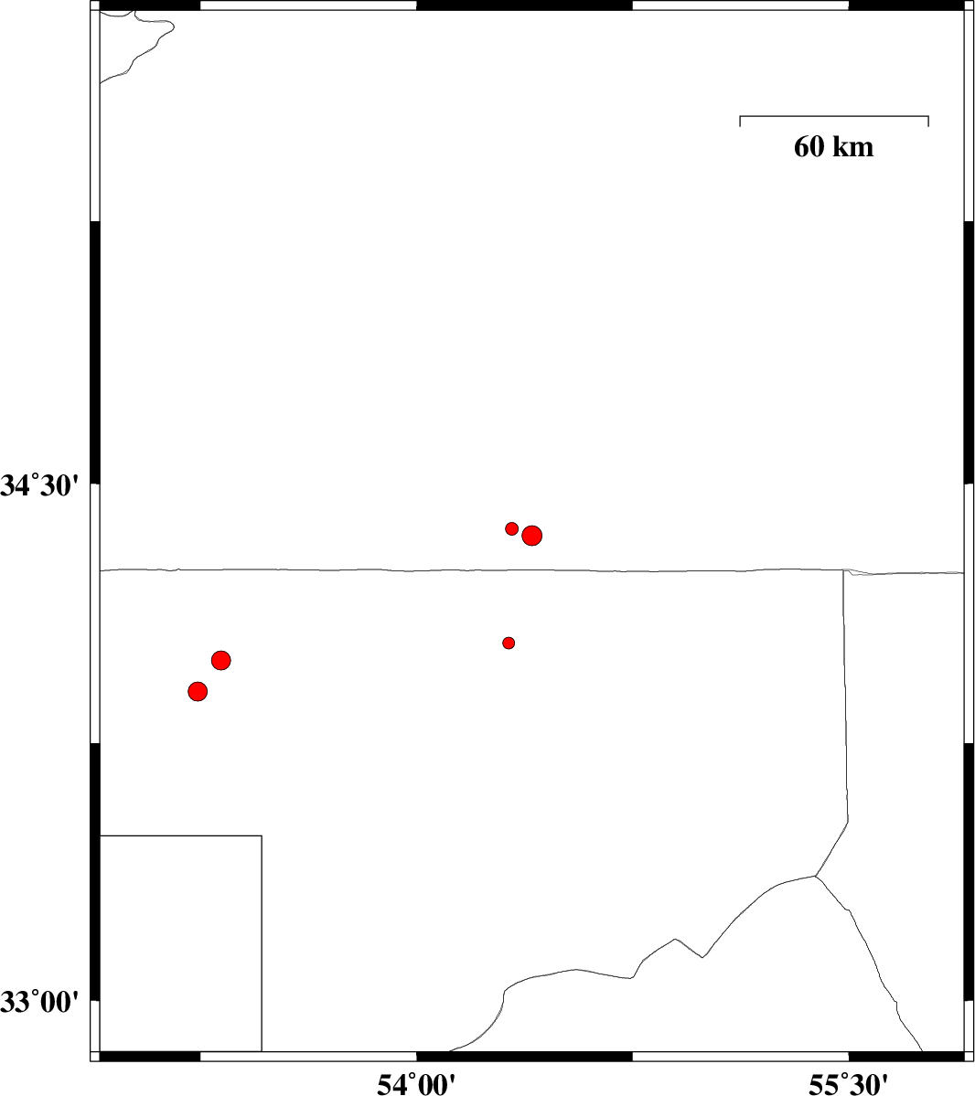 | 2013/03/24 | 14:52:02.5 | 19:22:02.5 | 33.99 | 53.32 | 14 | ML:3 | Esfahan Province, 126 km North-East of Nain |