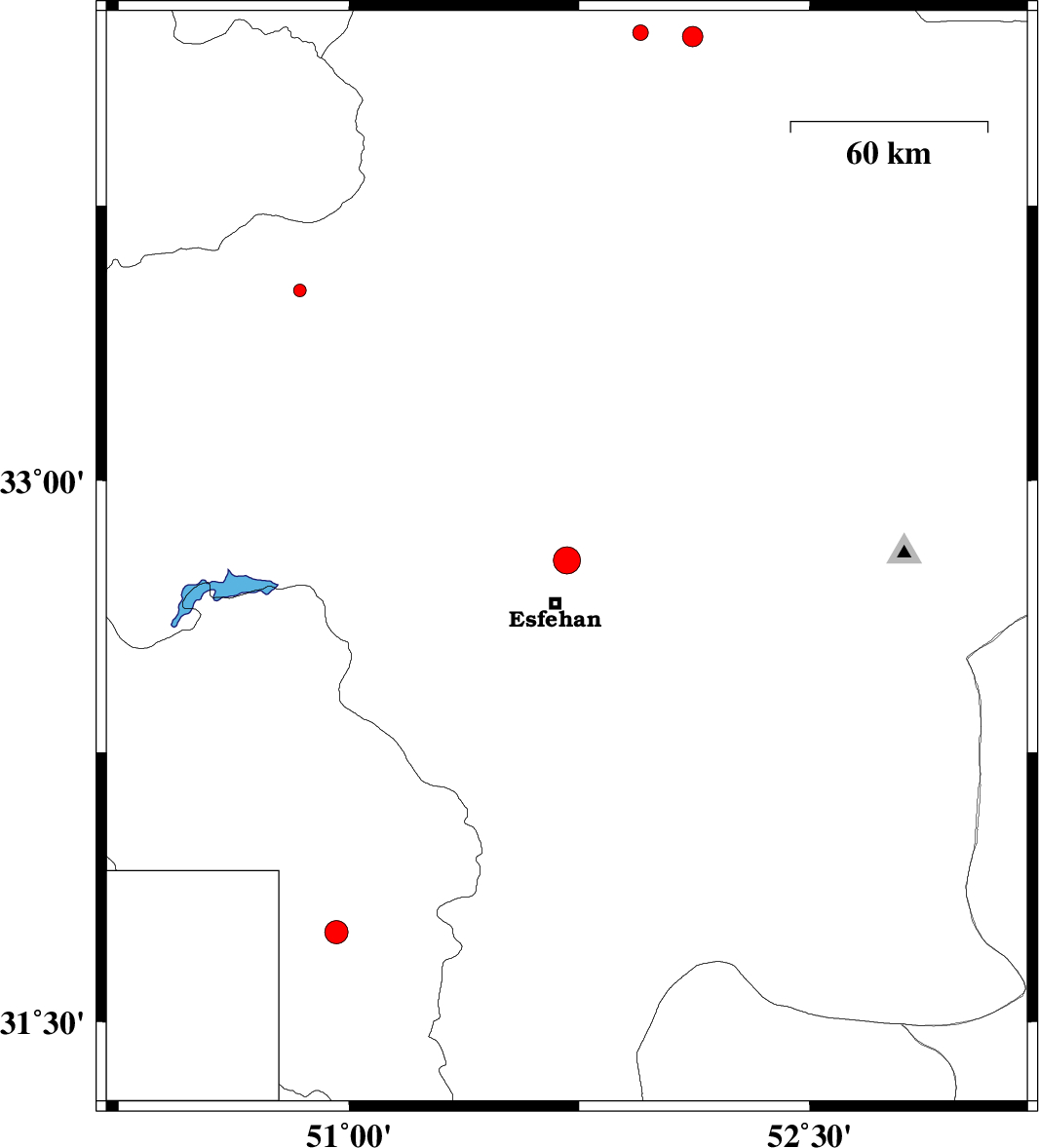 | 2013/04/19 | 20:22:34.6 | 00:52:34.6 | 32.78 | 51.71 | 14 | ML:4 | Esfahan Province, 13 km North of Esfahan | ||