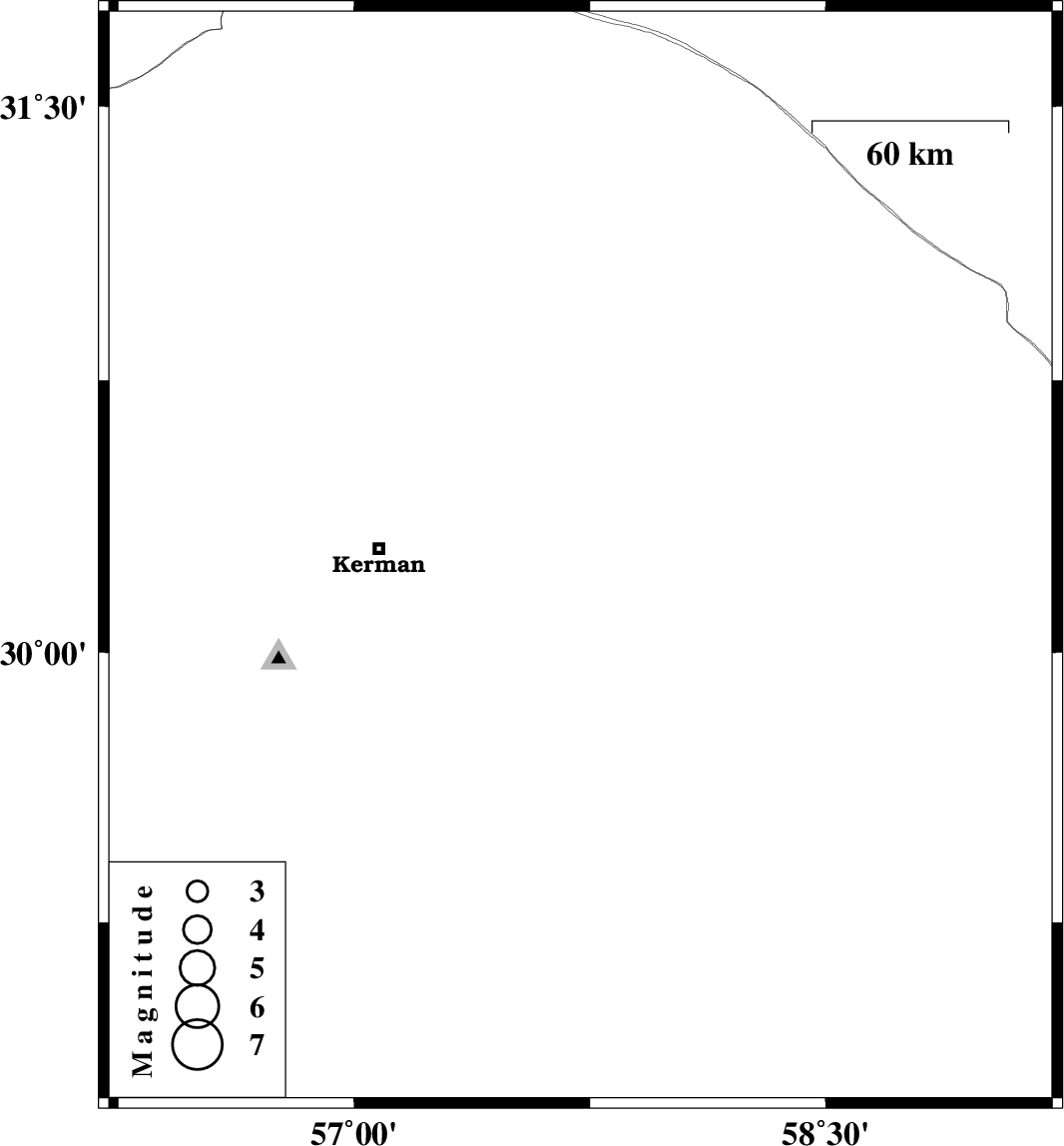 | 2013/04/19 | 22:34:41.4 | 03:04:41.4 | 30.26 | 57.72 | 14 | ML:2.7 | Kerman Province, 61 km East of Kerman |