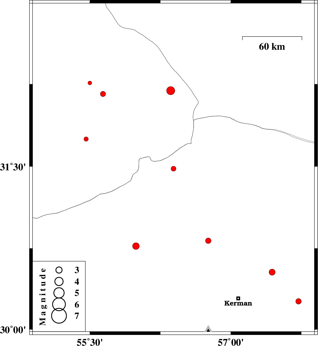 | 2013/04/19 | 22:34:41.4 | 03:04:41.4 | 30.26 | 57.72 | 14 | ML:2.7 | Kerman Province, 61 km East of Kerman | ||