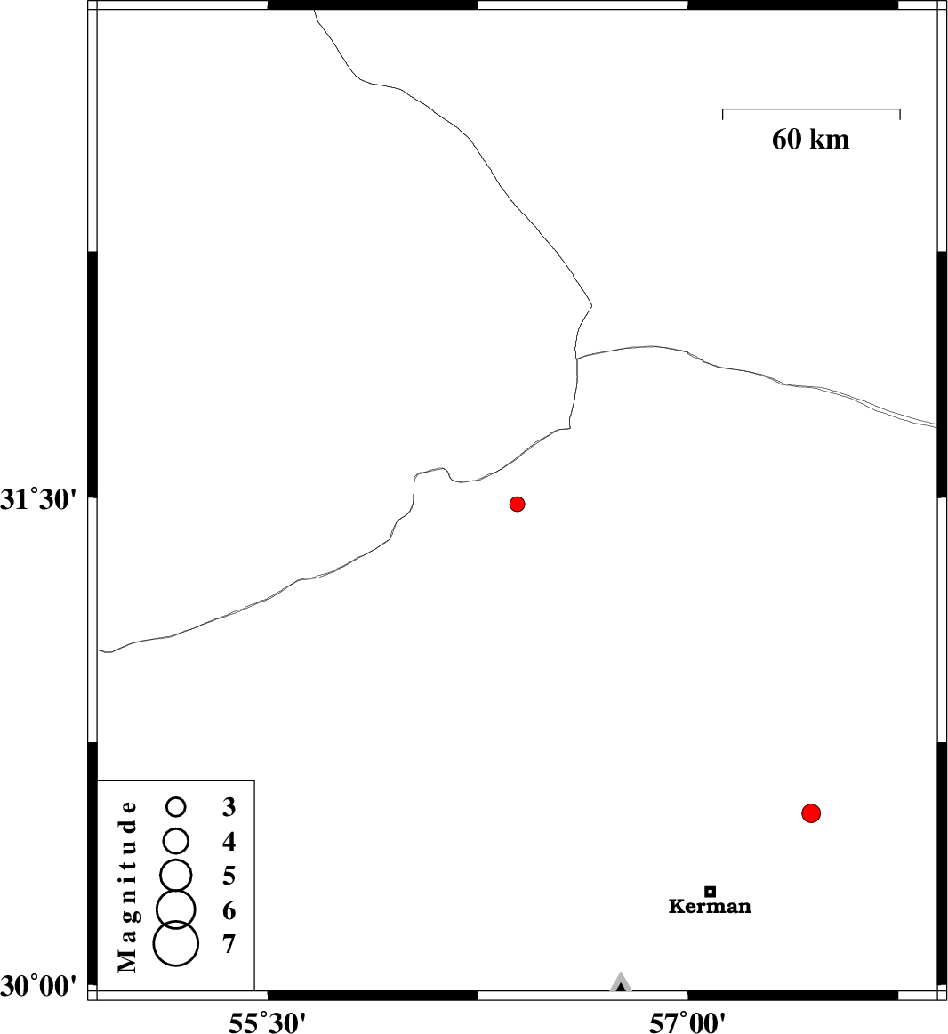 | 2013/04/27 | 03:22:20.5 | 07:52:20.5 | 30.53 | 57.44 | 16 | ML:2.9 | Kerman Province, 44 km North-East of Kerman |