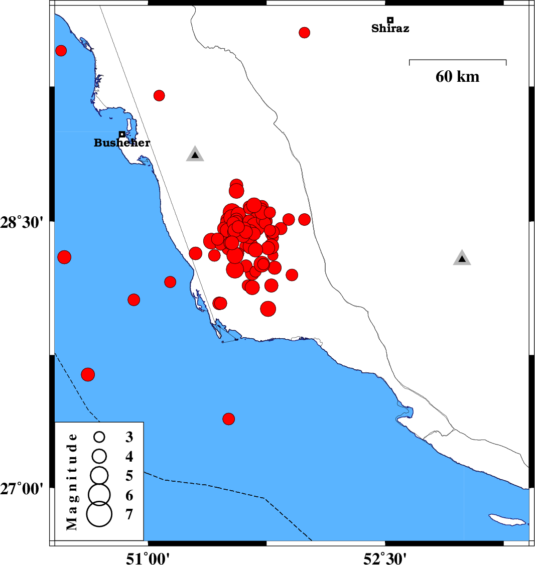 2013/04/10 19:41:57.5 00:11:57.5 28.4551.5530 ML:3.9 Bushehr Province, 28 km South-East of Khormog