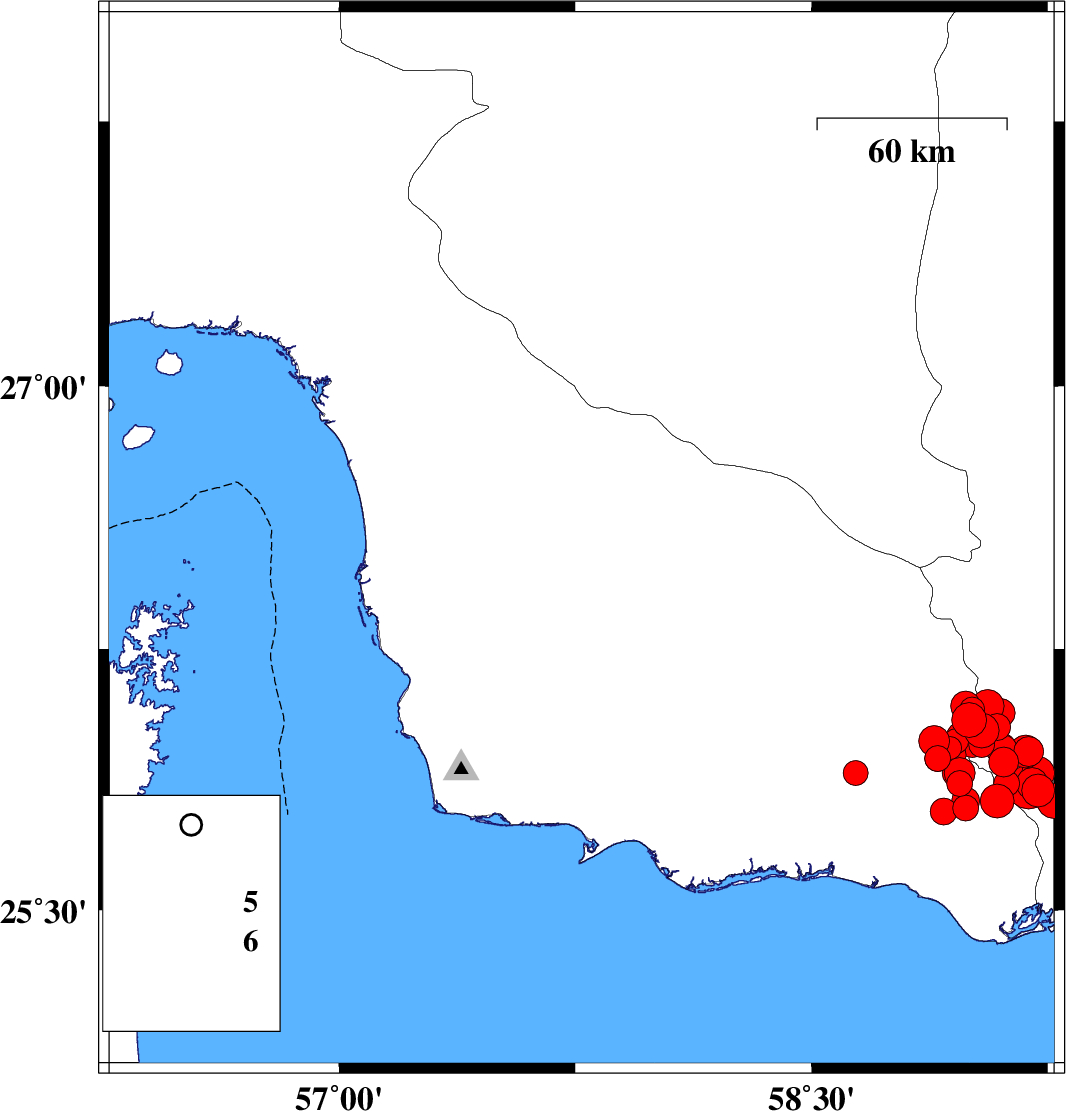 2013/05/11 22:23:05.8 02:53:05.8 26.7557.5814 ML:5 Hormozgan Province, 74 km South of Manujan