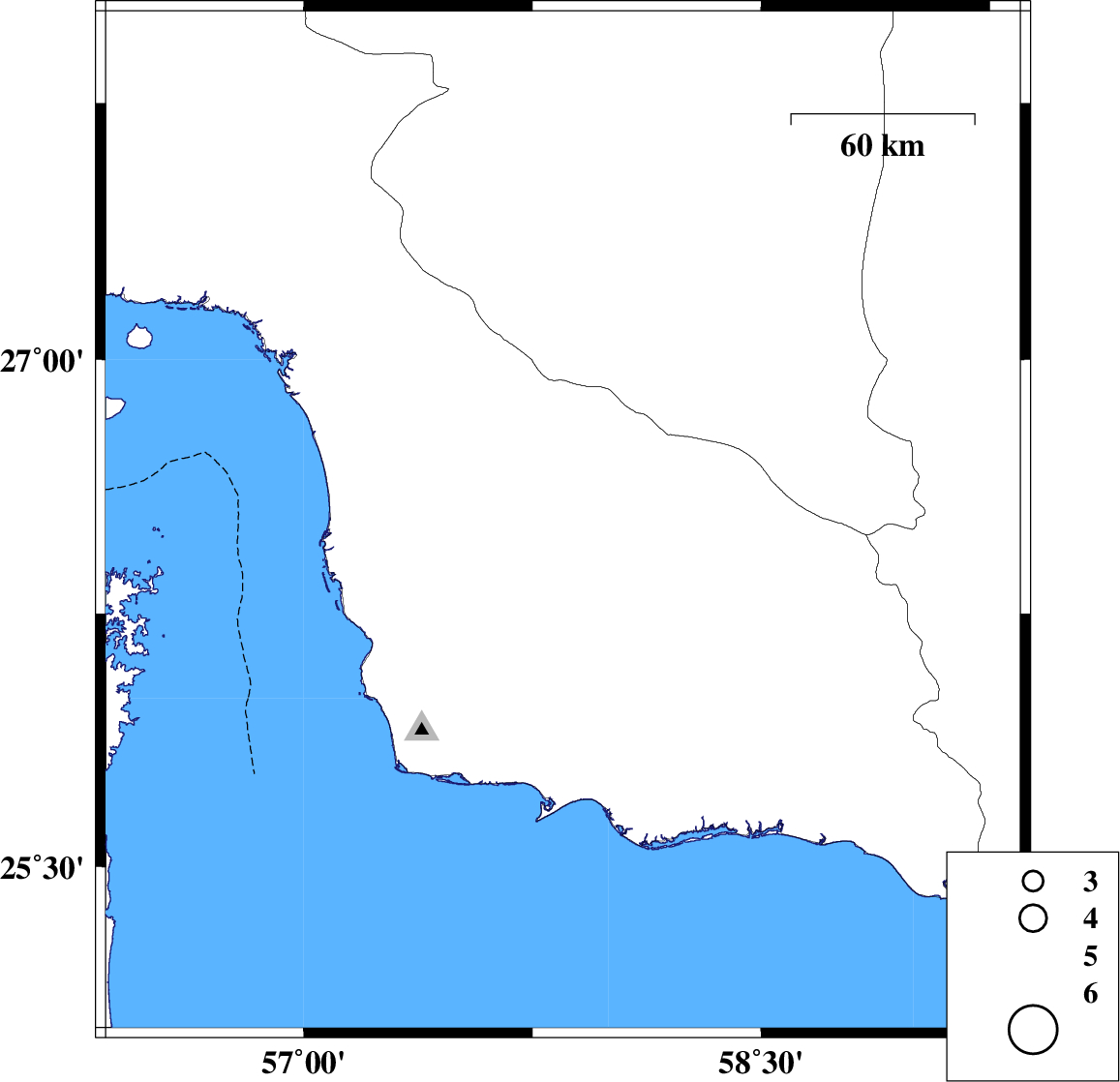 2013/05/11 03:09:48.1 07:39:48.1 26.5257.8715 Ms:5.7 Hormozgan Province, 99 km North-East of Jask