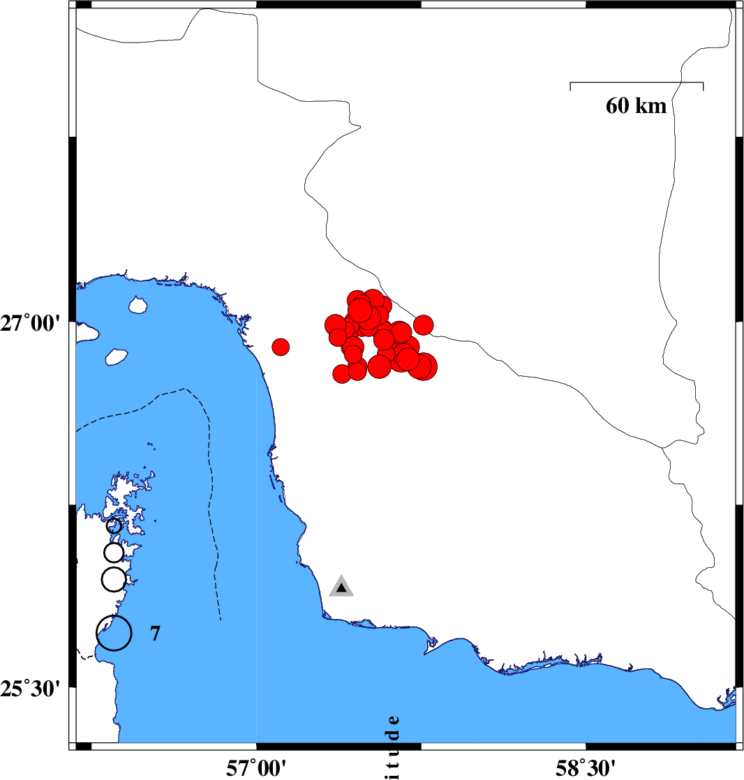 2013/05/11 22:28:08.5 02:58:08.5 26.6957.4714 ML:4.4 Hormozgan Province, 80 km South of Manujan