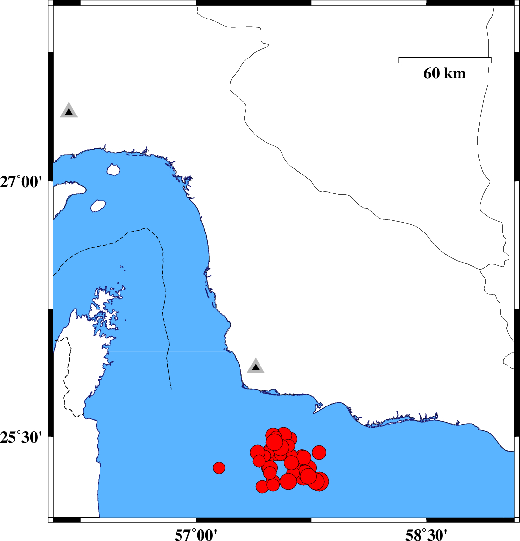 2013/05/11 22:23:05.8 02:53:05.8 26.7557.5814 ML:5 Hormozgan Province, 74 km South of Manujan