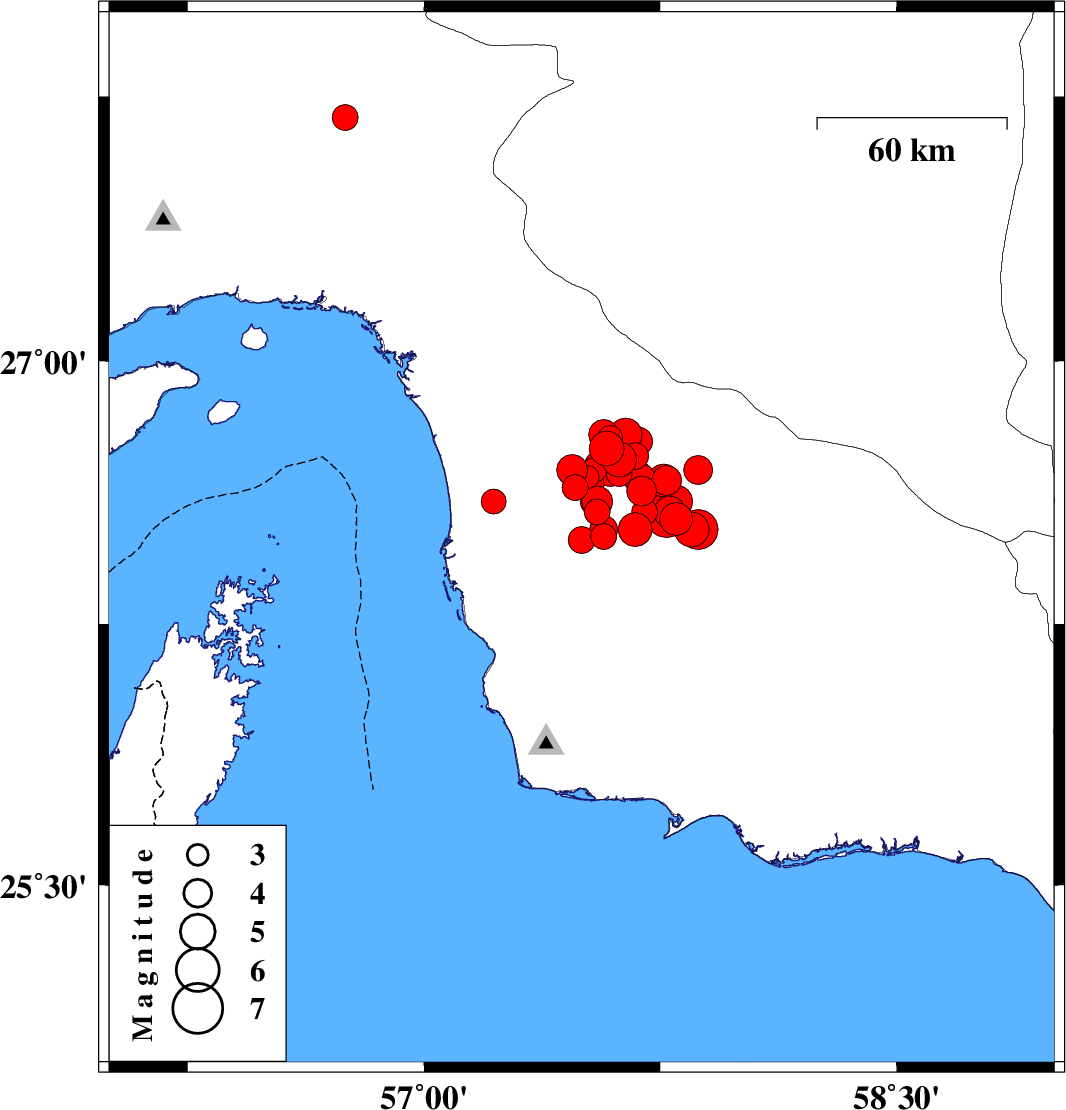 2013/05/11 22:23:05.8 02:53:05.8 26.7557.5814 ML:5 Hormozgan Province, 74 km South of Manujan