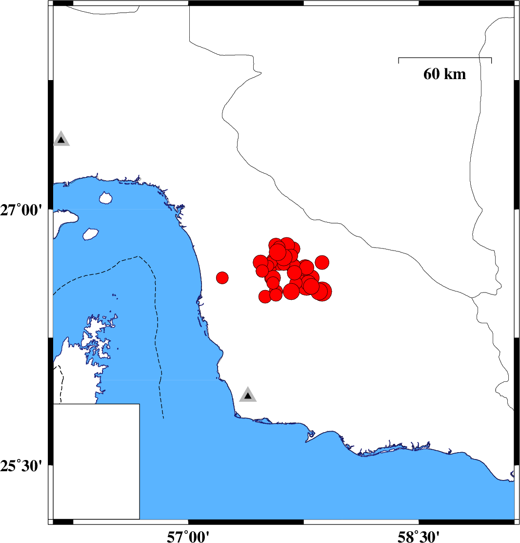 2013/05/11 22:23:05.8 02:53:05.8 26.7557.5814 ML:5 Hormozgan Province, 74 km South of Manujan