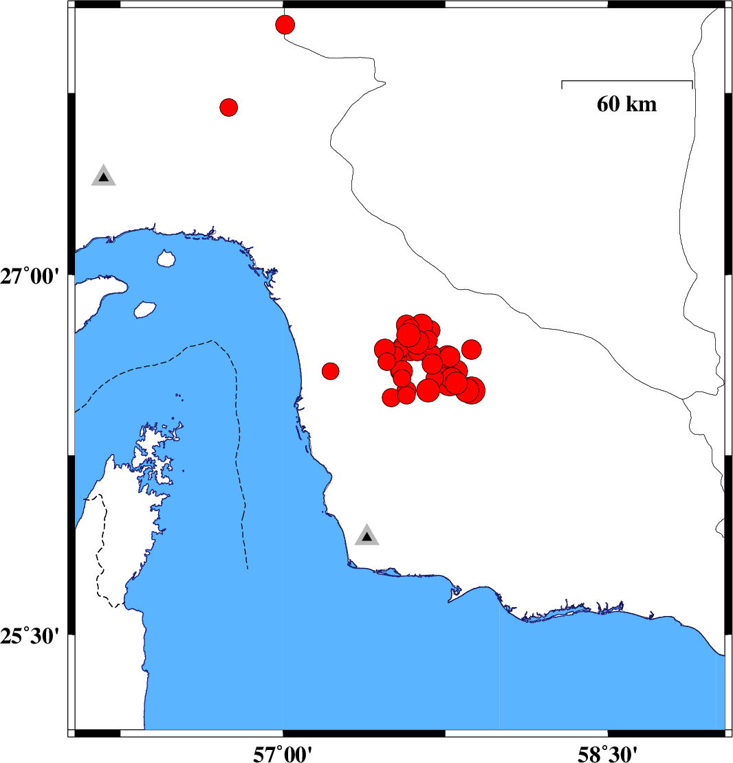 2013/05/11 22:23:05.8 02:53:05.8 26.7557.5814 ML:5 Hormozgan Province, 74 km South of Manujan