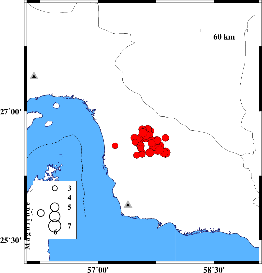2013/05/11 22:23:05.8 02:53:05.8 26.7557.5814 ML:5 Hormozgan Province, 74 km South of Manujan