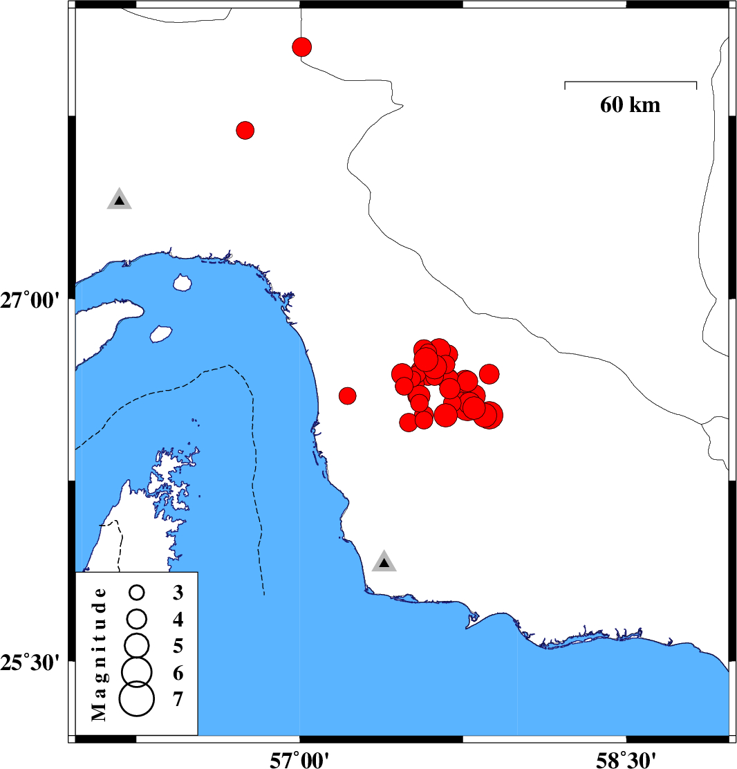2013/05/11 22:23:05.8 02:53:05.8 26.7557.5814 ML:5 Hormozgan Province, 74 km South of Manujan
