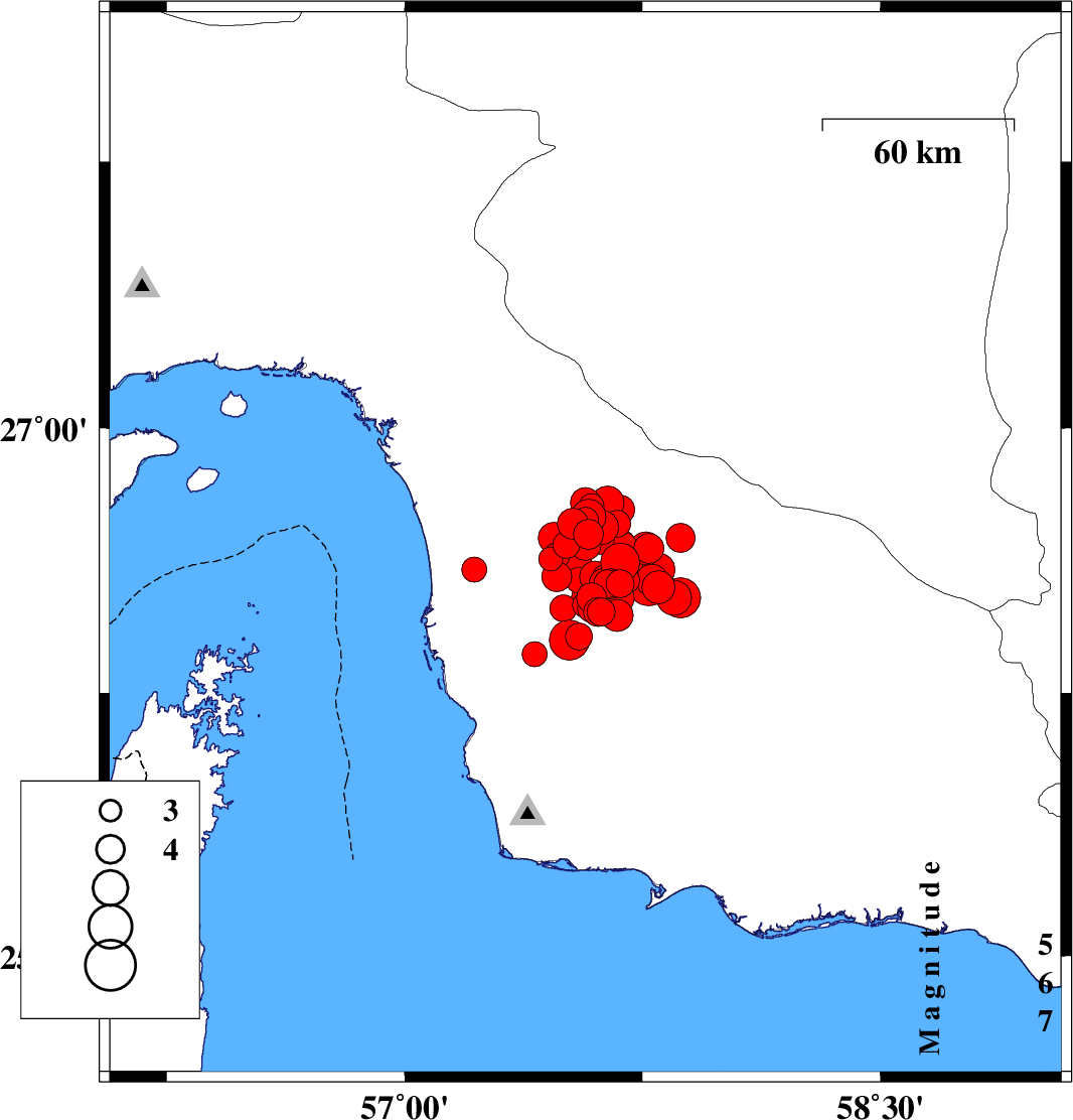 2013/05/11 22:23:05.8 02:53:05.8 26.7557.5814 ML:5 Hormozgan Province, 74 km South of Manujan