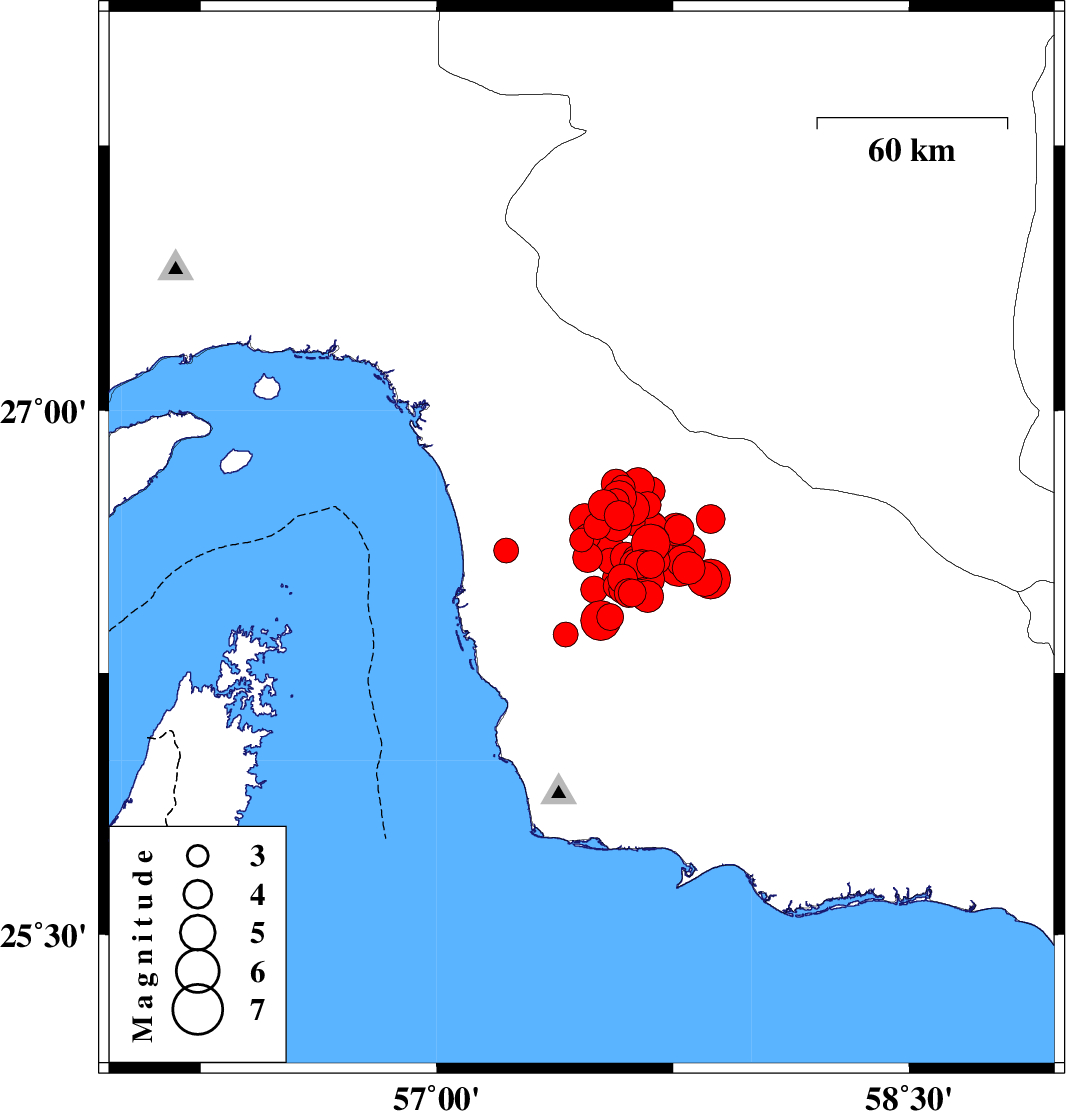 2013/05/11 22:23:05.8 02:53:05.8 26.7557.5814 ML:5 Hormozgan Province, 74 km South of Manujan