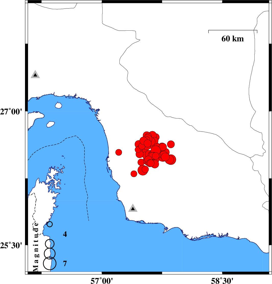 2013/05/11 22:23:05.8 02:53:05.8 26.7557.5814 ML:5 Hormozgan Province, 74 km South of Manujan
