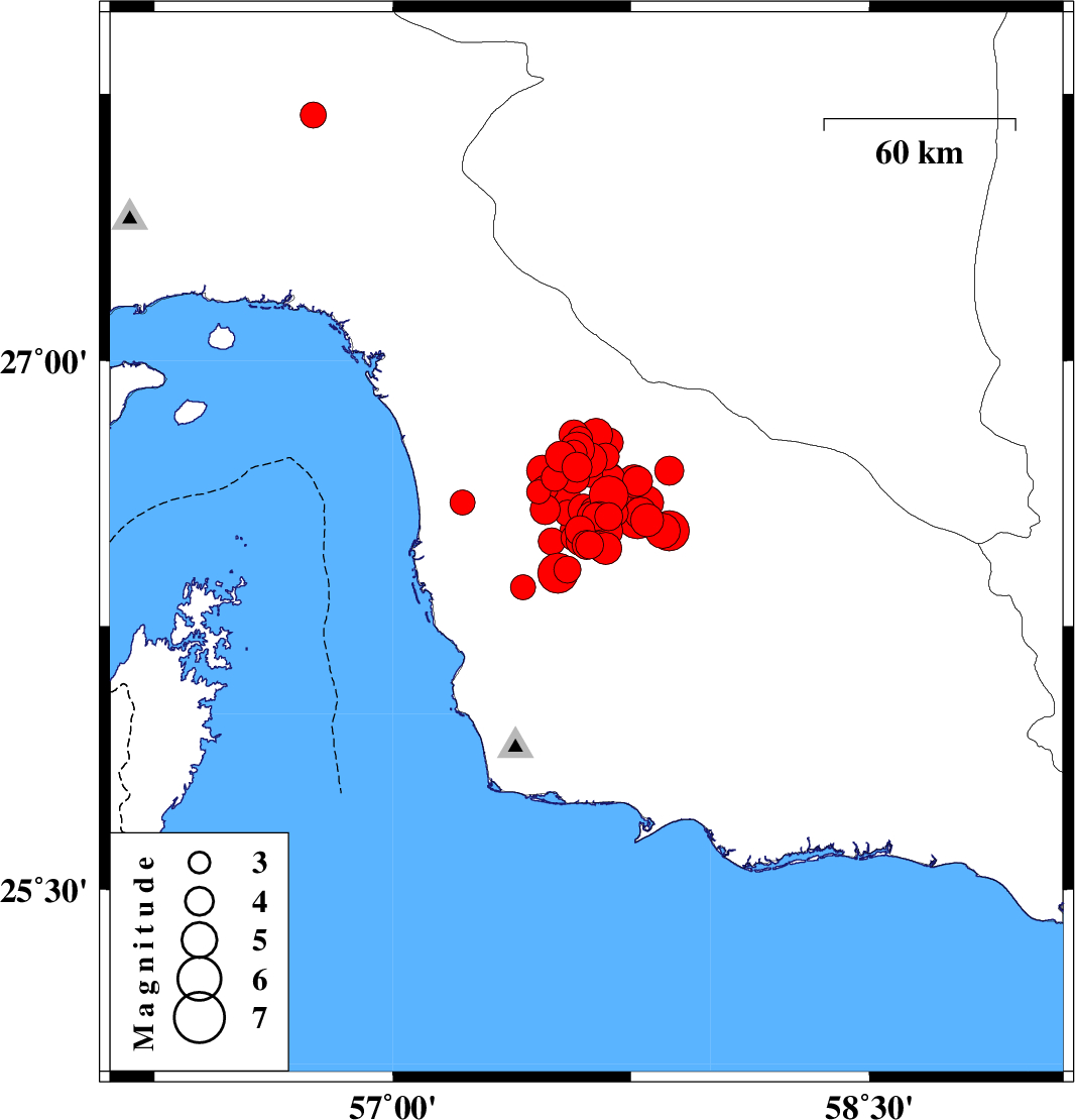 2013/05/11 22:23:05.8 02:53:05.8 26.7557.5814 ML:5 Hormozgan Province, 74 km South of Manujan