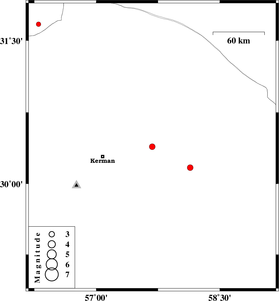 | 2013/05/13 | 20:36:59.5 | 01:06:59.5 | 30.39 | 57.68 | 15 | ML:3.2 | Kerman Province, 59 km East of Kerman | ||