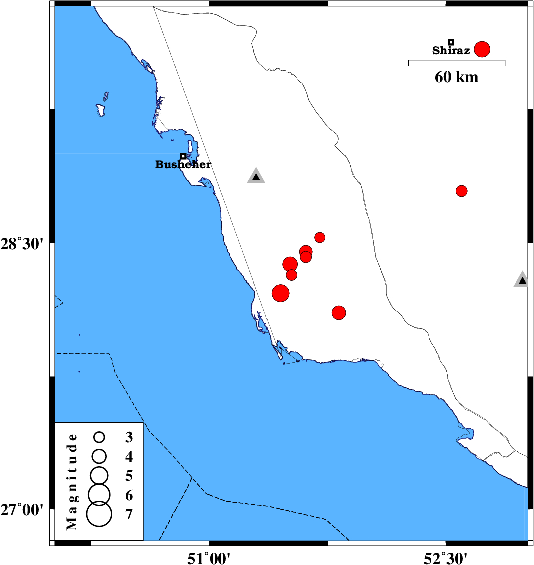 | 2013/05/09 | 03:29:37.2 | 07:59:37.2 | 28.11 | 51.82 | 31 | ML:4 | Bushehr Province, 39 km North-West of Bandar-e kangan | ||
