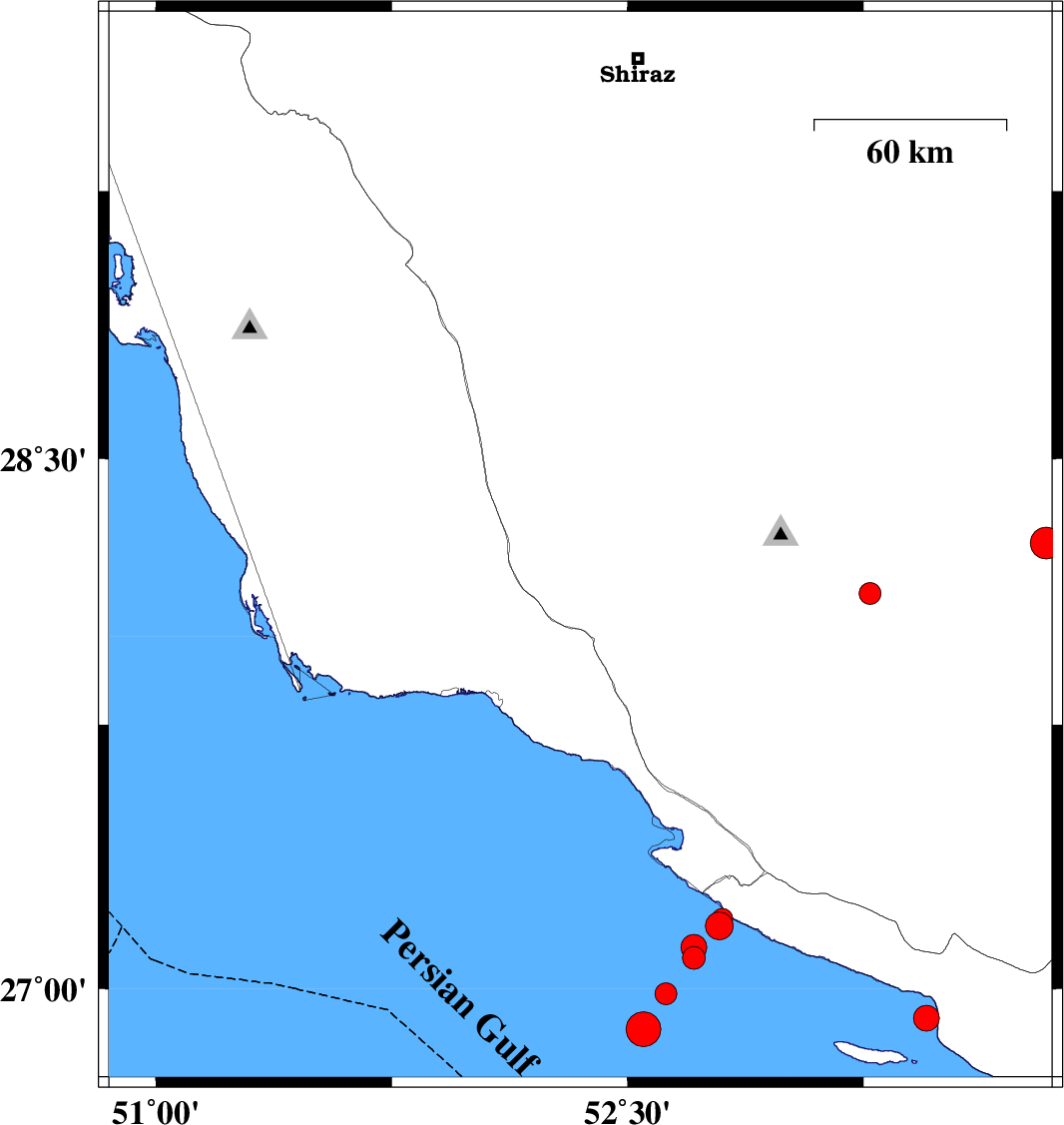 | 2013/05/14 | 00:19:50.2 | 04:49:50.2 | 28.32 | 51.52 | 37 | ML:3.1 | Bushehr Province, 40 km South-East of Khormog | ||