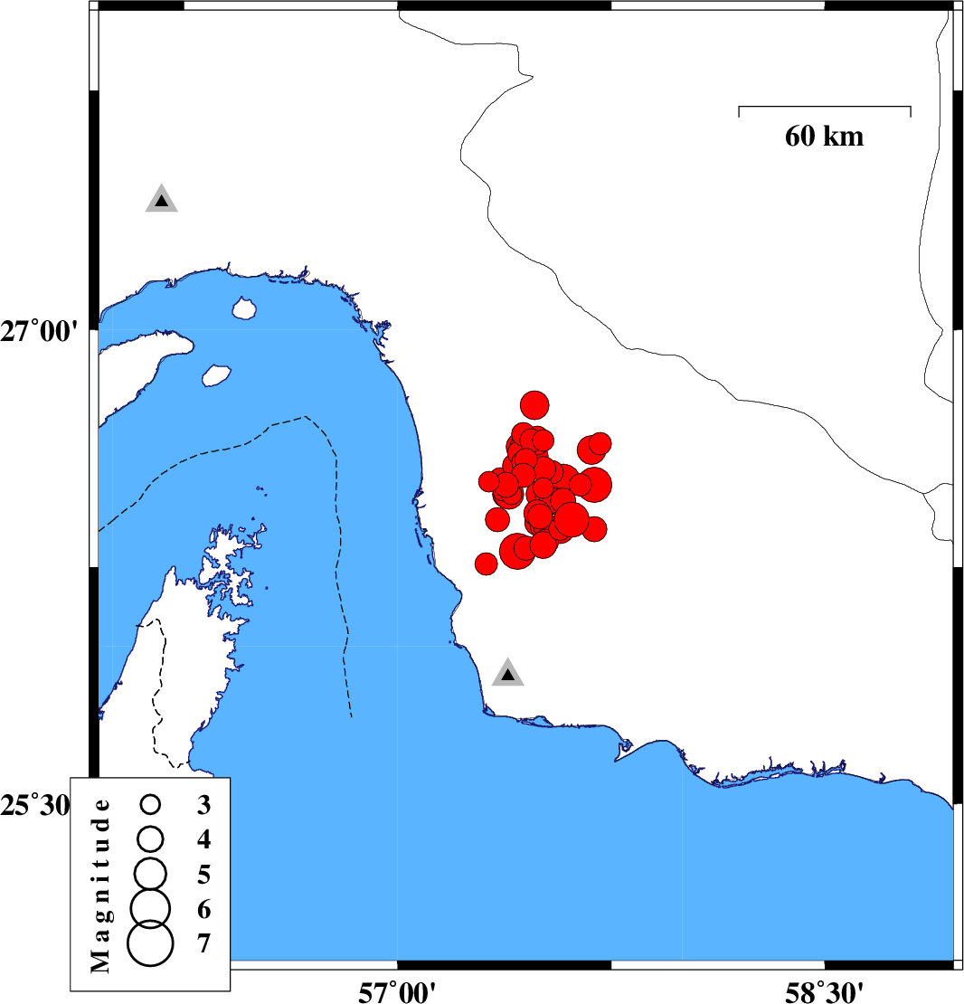 2013/05/14 10:02:36.7 14:32:36.7 26.5157.614 ML:4 Hormozgan Province, 100 km South-East of Manujan