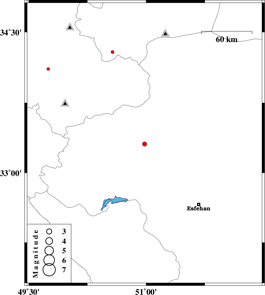 | 2013/05/20 | 09:46:55.1 | 14:16:55.1 | 34.11 | 49.75 | 27 | ML:1.7 | Markazi Province, 6 km Arak |