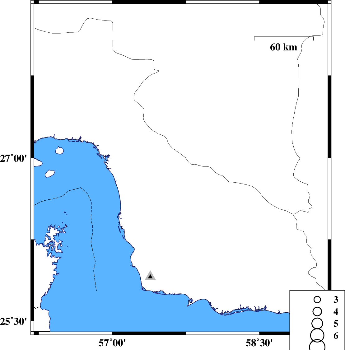 2013/05/14 10:02:36.7 14:32:36.7 26.5157.614 ML:4 Hormozgan Province, 100 km South-East of Manujan