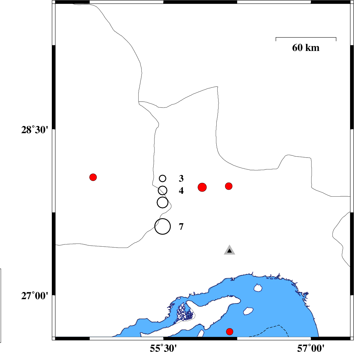 | 2013/04/24 | 03:51:14.5 | 08:21:14.5 | 27.93 | 55.1 | 43 | ML:3.6 | Fars Province, 80 km North-East of Lar |