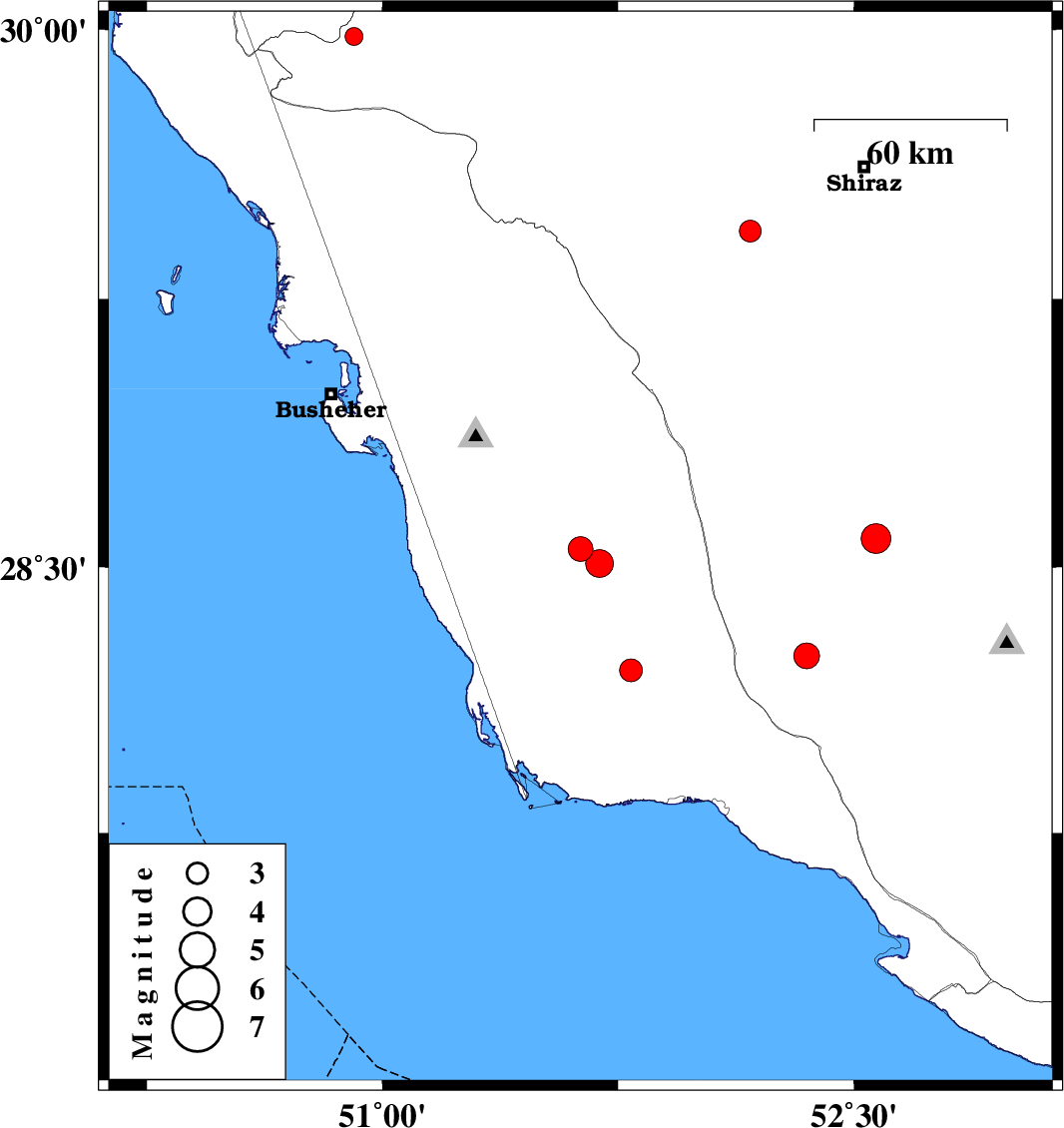 | 2013/05/16 | 07:16:48.3 | 11:46:48.3 | 28.51 | 51.69 | 14 | ML:4 | Bushehr Province, 35 km South-East of Khormog |