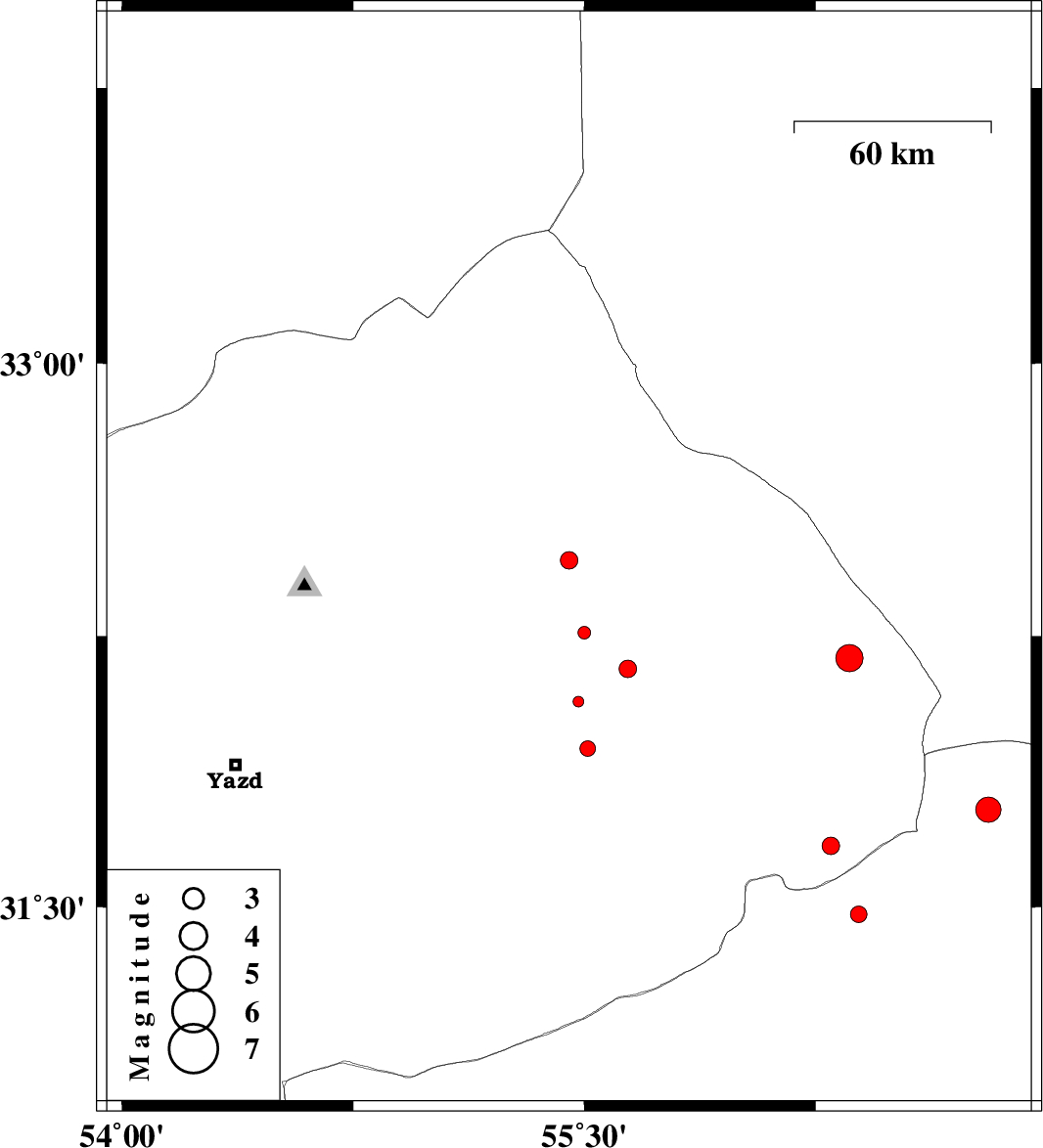 | 2013/04/22 | 12:14:28.9 | 16:44:28.9 | 32.26 | 55.5 | 14 | ML:1.8 | Yazd Province, 73 km North-East of Bafq |