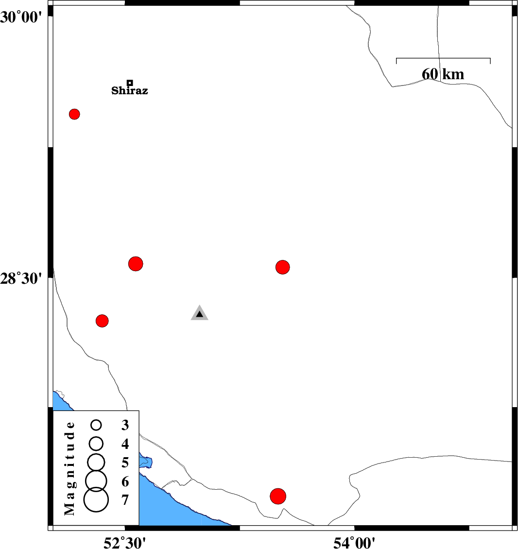 | 2013/05/21 | 14:42:43.7 | 19:12:43.7 | 28.58 | 52.57 | 15 | ML:4.3 | Fars Province, 27 km South of Firuz Abad | ||