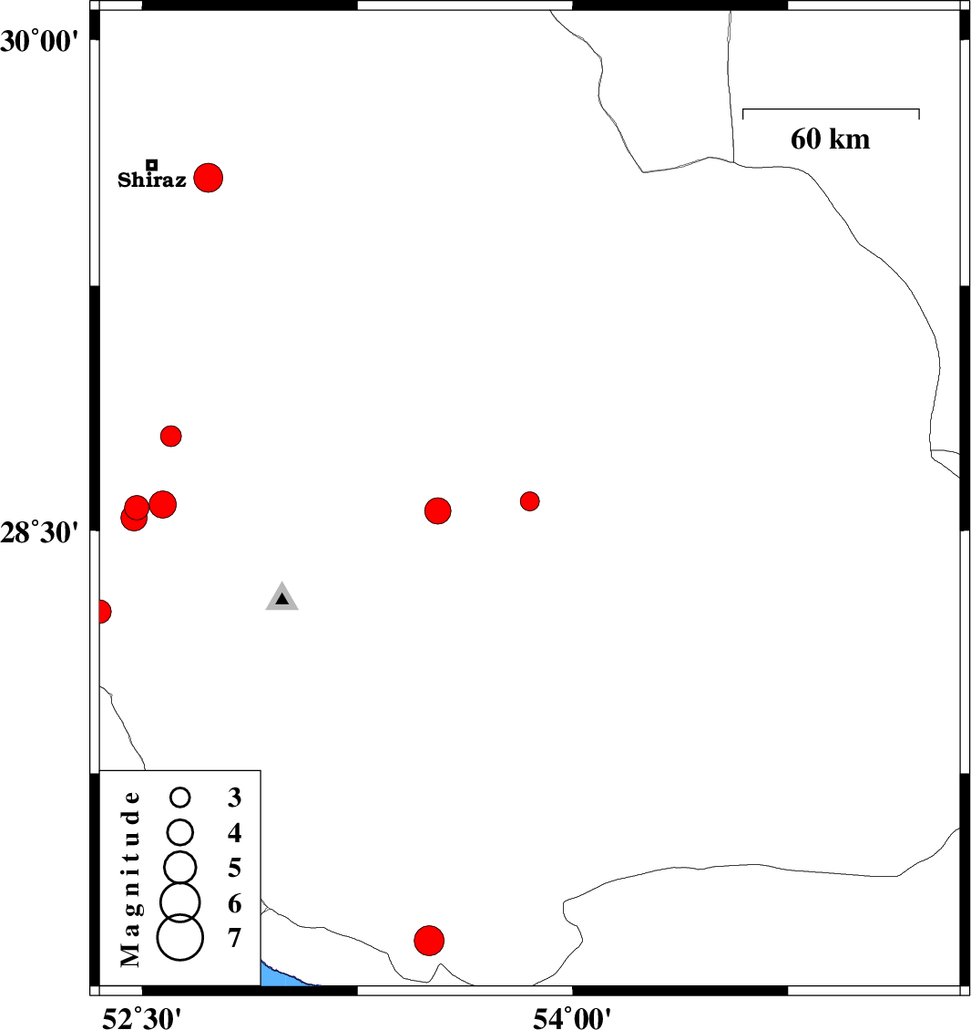 | 2013/05/21 | 14:42:43.7 | 19:12:43.7 | 28.58 | 52.57 | 15 | ML:4.3 | Fars Province, 27 km South of Firuz Abad | ||
