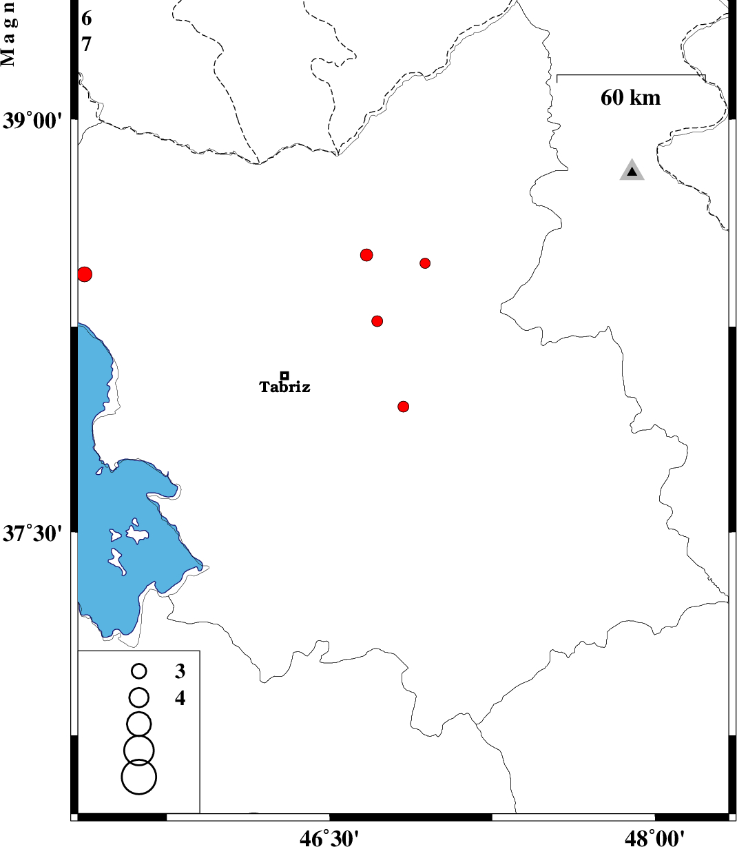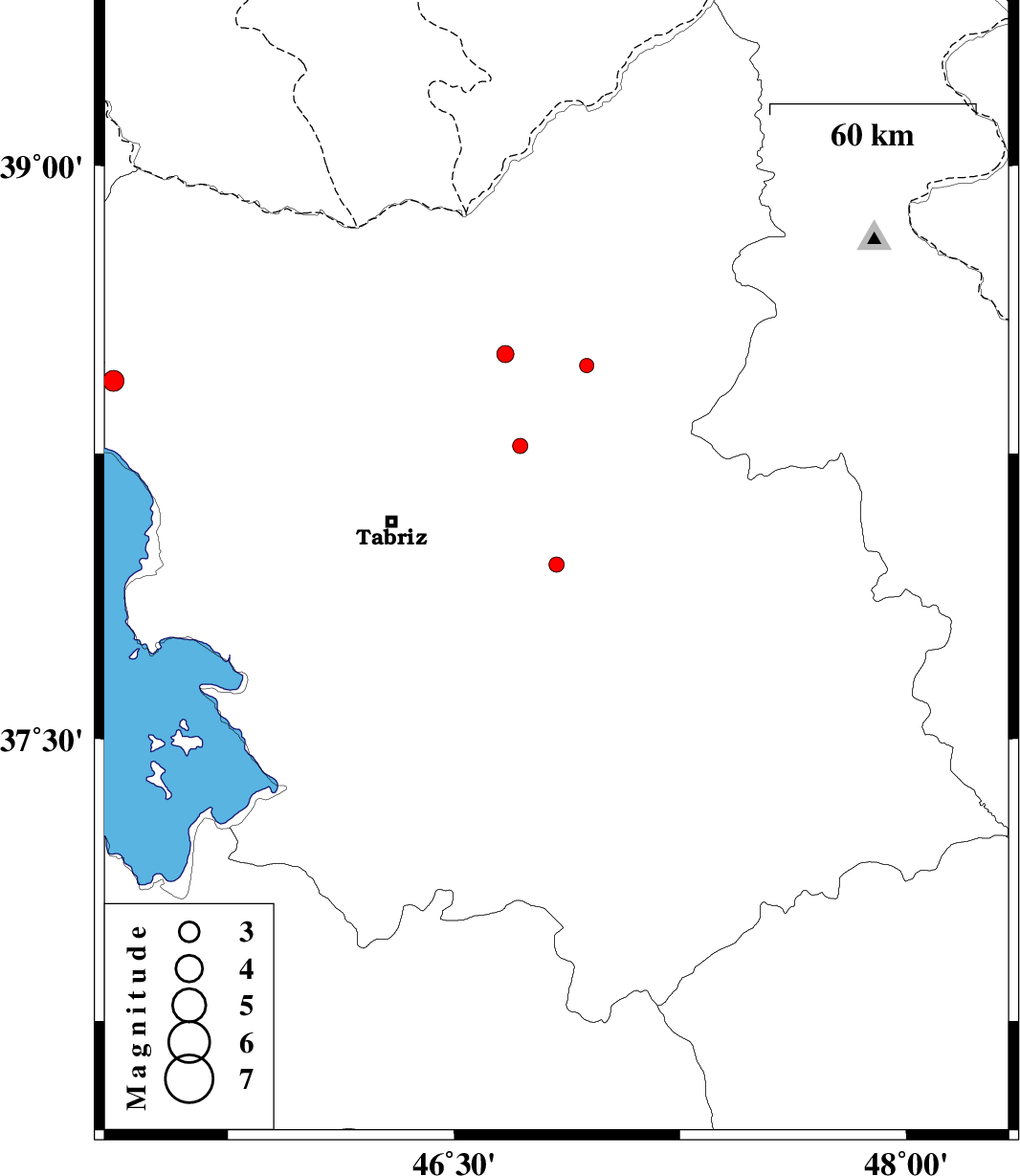 | 2013/05/29 | 08:15:27.9 | 12:45:27.9 | 37.96 | 46.84 | 14 | ML:2.3 | Azarbaijan Sharghi Province, 13 km North of Bostanabad | ||