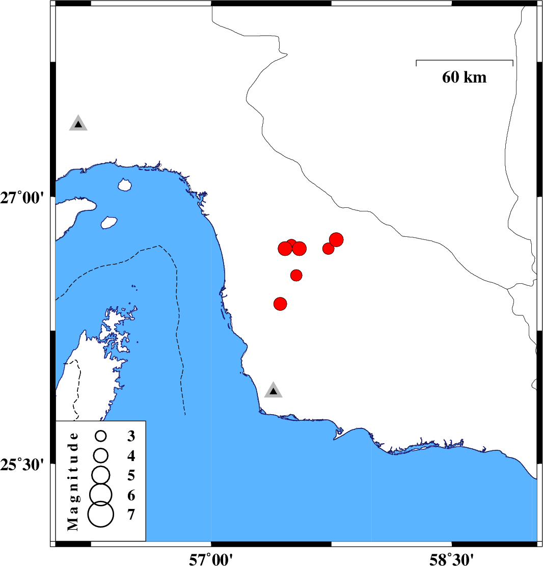 | 2013/05/30 | 05:19:39.8 | 09:49:39.8 | 26.56 | 57.53 | 8 | ML:3.2 | Hormozgan Province, 95 km South of Manujan | ||