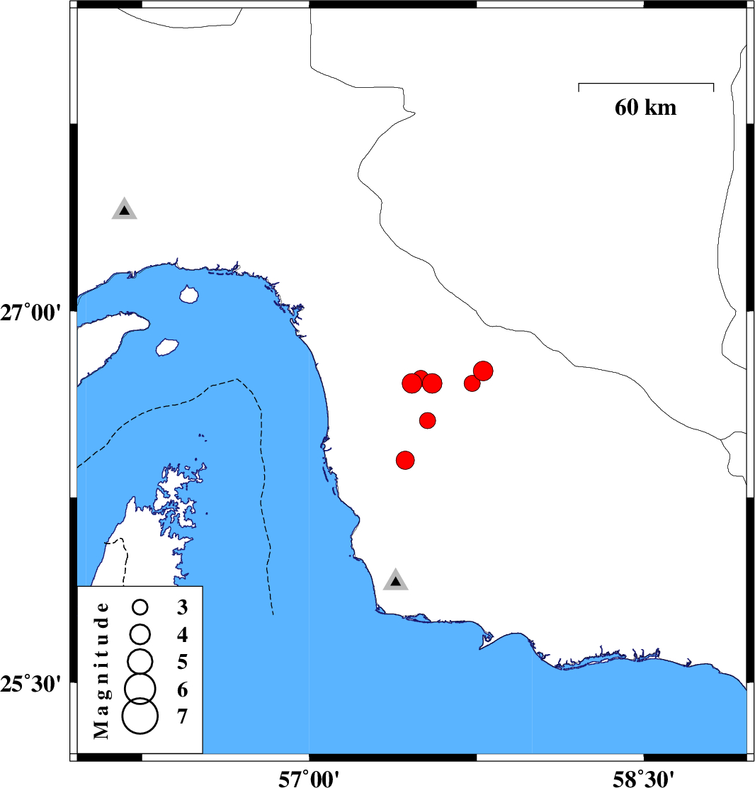 | 2013/05/30 | 05:19:39.8 | 09:49:39.8 | 26.56 | 57.53 | 8 | ML:3.2 | Hormozgan Province, 95 km South of Manujan | ||